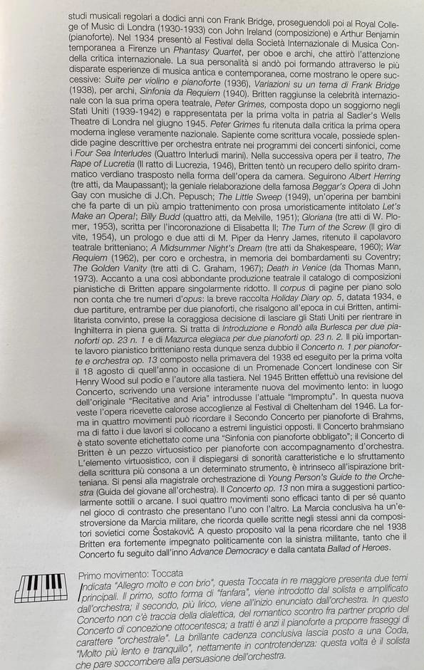 Michele Mariotti and Alessandro Taverna play Britten Piano Concerto op 13 on Good Friday in Rome. An early work written in 1938 receiving its first performance from the composer himself at the Proms under Sir Henry Wood and in the revised 1946 version Noel Newton-Wood (a name unjustly forgotten). In 1939 Britten and Pears left for America with the air of war becoming ever more apparent in Europe. It was revived in 1965 for Sviatoslav Richter who thanks to Britten was allowed out of Russia to take part in his Aldeburgh Festival where he and Rostropovich were regular visitors up to Britten’s early death in 1976. His simple tombstone in the graveyard of Aldeburgh is a fitting tribute to one of the most important composers of the twentieth century. Strangely his output for solo piano was very small but he will rightly be remember for his thirteen operas of which Peter Grimes in 1945 changed the course of opera creating a new dramatic art form. His only solo piano works are the youthful Holiday Diary Suite and later he wrote a nocturne as a set work for the first Leeds International Piano Competition having been bullied to be on the jury too by the indomitable Fanny Waterman. I was invited in 1973 ,whilst studying with Agosti in Rome ,to play them all over Italy by the British Council to celebrate the sixtieth birthday of the composer.