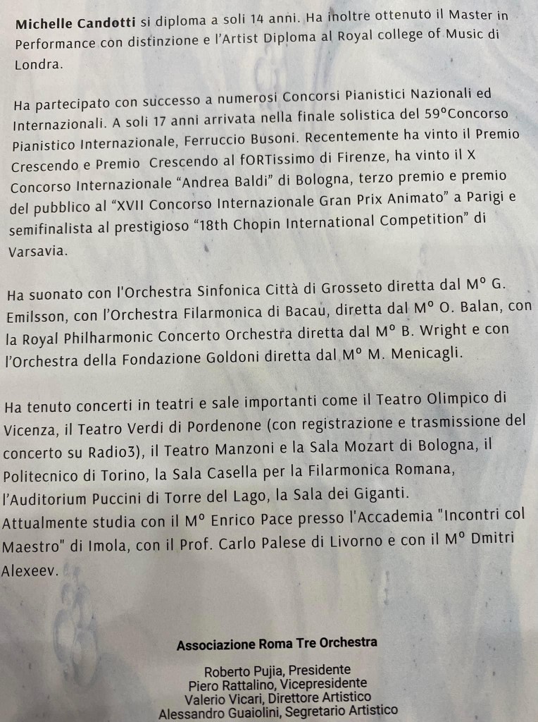Michelle Candotti for the Roma Tre Young Artists Series is a pianist who I had noted in the Chopin Competition in Warsaw.A slender young lady from Livorno who plays like a lion with intelligence and technical prowess and breathtaking excitement as she enacts the music before our very eyes.