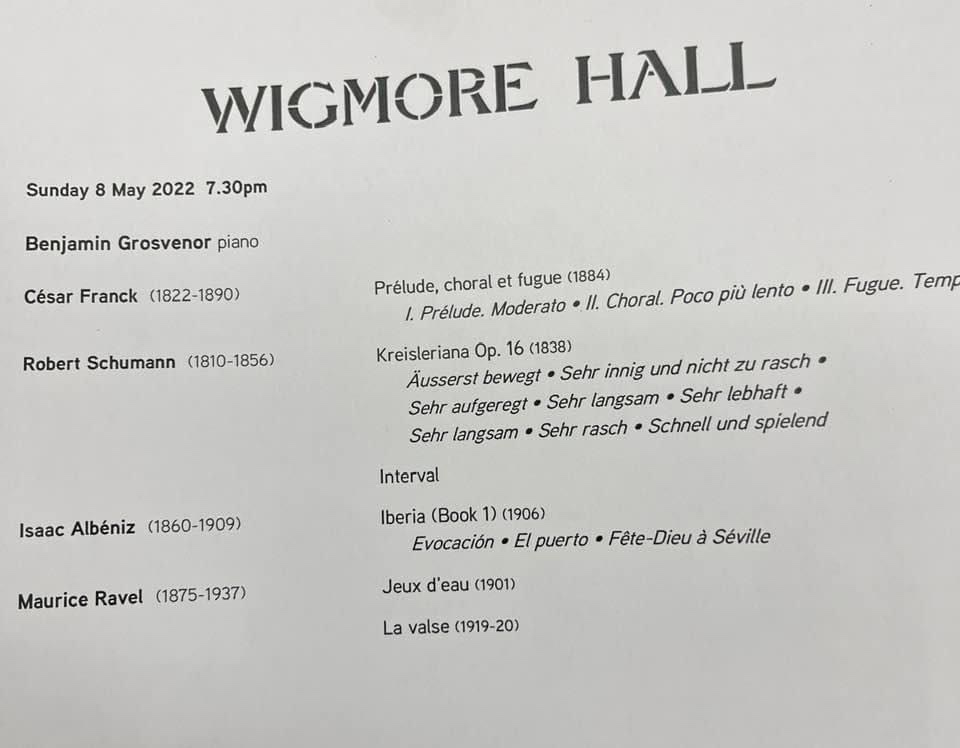 The Cesar Franck Prelude,Chorale and Fugue was like embarking on a voyage of discovery.A work I have heard many times ,even this week,and is returning more regularly into the concert repertoire.But today’s performance was different.From the opening notes played with such delicacy it was like a cloud of smoke hovering above the keys until gradually the declamatory chords brought us back to the real world.Some very subtle contrapuntal playing of ravishing sounds but as the tension mounted the sound began to harden and remarkable as it was missed the sumptuous rich sound of the truly grand style.The simple plain chant of the chorale was answered by the celestial chords spread across the keyboard gaining ever more in intensity until the insinuating announcement of the fugue with its fanfare flourishes of bravura and the very sombre ‘largamente’ announcement of the fugue subject.His wonderful sense of balance allowed for such clarity of line with cascades of embellishments as it built to the climax and the release of tension in the cadenza.The return of the opening melody was allowed to shine so beautifully through the magic cloud of sound that he had created and gradually built to the climax where the two main themes are united in a glorious outpouring of sounds ‘con molto fuoco’.There was great excitement too in the quiet build up to the final triumphant explosion.An aristocratic ending to a remarkable performance that in a bigger more resonant hall might have given more weight to Franck’s explosions of the glorious sounds of a true believer.