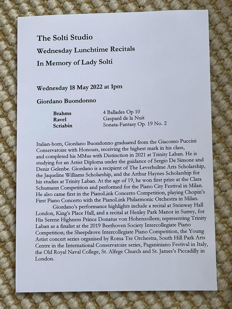 There was magic in the air at the Solti Studio today with a young Italian pianist Giordano Buondonno surely a name to remember after today’s masterly performances.