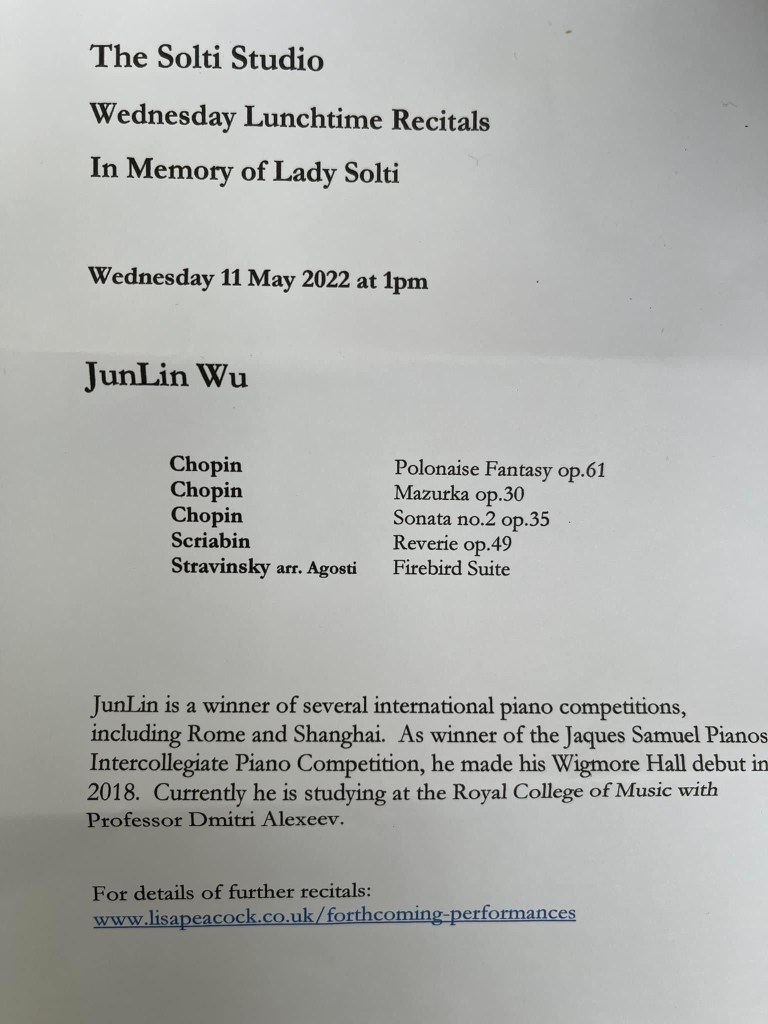 There was magic in the air at the Solti Studio today with a young Italian pianist Giordano Buondonno surely a name to remember after today’s masterly performances. A student of Deniz Arman Gelenbe that was immediately apparent from the refined musicality of his performance of the Brahms Ballades op 10.