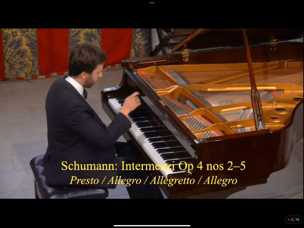Schumann composed the Intermezzi Op. 4 in Spring 1832 and declared that they were special works, conceived as “longer Papillons” where “every note ought to be weighed and balanced”. The Intermezzi employ the same techniques used in Op. 2: quotations, fragments, and metamorphoses of poetry into music.The scherzo-like No. 2 in E minor is a depiction of Faust’s and Mephistopheles’ journey through the air; there is much interest in the complex rhythms that throw the underlying pulse out of sync with the melodic and harmonic rhythm. Unusual rhythms and accentuation highlight the main section of No. 3 in A minor; Schumann curiously labels the faster central section “Alternativo.” Schumann constructed No. 4 in C major, the shortest of the Intermezzi, from fragments of three earlier discarded works. No. 5 in D minor is more lyrical than its partners, in spite of its fast tempo; the central section, labeled “Alternativo” as in No. 3 above, is probably the most beautiful passage in the entire set. It was exactly the contrast of quixotic and romantic that was so fascinating.Damir has a way of coaxing the sounds out of the piano like a painter with strokes on the canvas which adds such a sumptuous sense of colour and balance to these flights of fancy.There are moments when the clouds seem to clear and we catch a glimpse of the sublime melodic line that is to become ever more evident in the works that are to follow on closely.From op 6 Davidsbundler through the extraordinary technical hurdles and romantic outpourings of the Toccata op 7 to the Carnaval op 9.These are like a painter trying out his ideas before arriving at the final masterpiece.Damir gave a very convincing performance that makes one want to hear the entire set of six as Schumann intended them to be heard together.