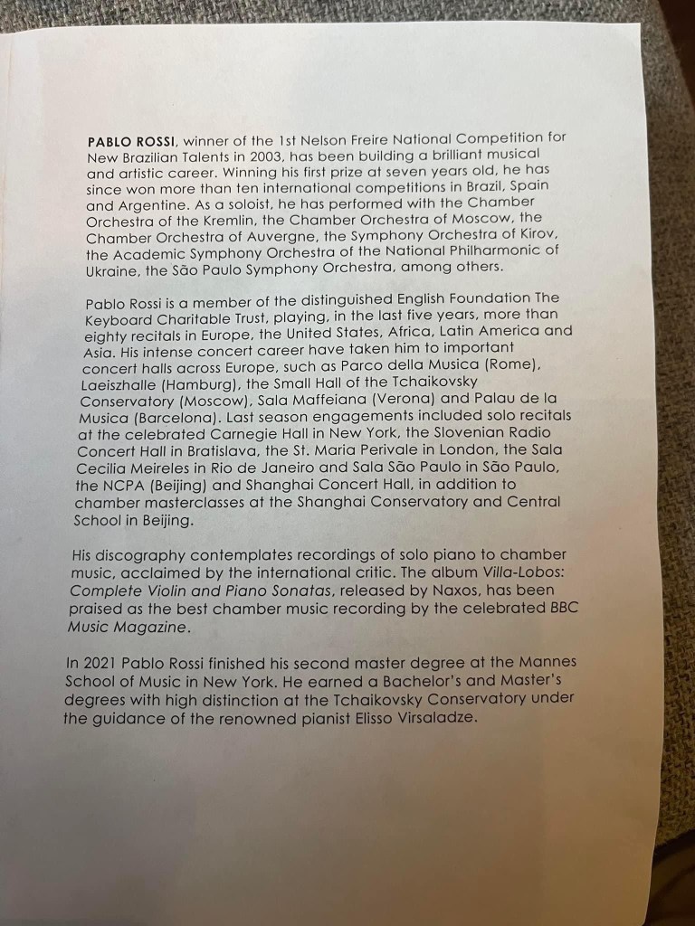 Now in 2022 the transformation from an extraordinarily talented young pianist into an artist of great stature took me completely by surprise.The assurance and authority not only in the music of his compatriot Villa Lobos and Prado ,but also the maturity and breathtaking sweep of his Schubert left me and all those present amazed.Still the young man of aristocratic bearing and irresistible charm ,even the same rather eccentric footwear,but there was above all the music and sense of communication that are of a born few.Pablo had the same charming asides that Rubinstein used to regale us with on his annual visits to London after a sumptuous feast of music played with an ease and simplicity that inspired generations of pianists.
