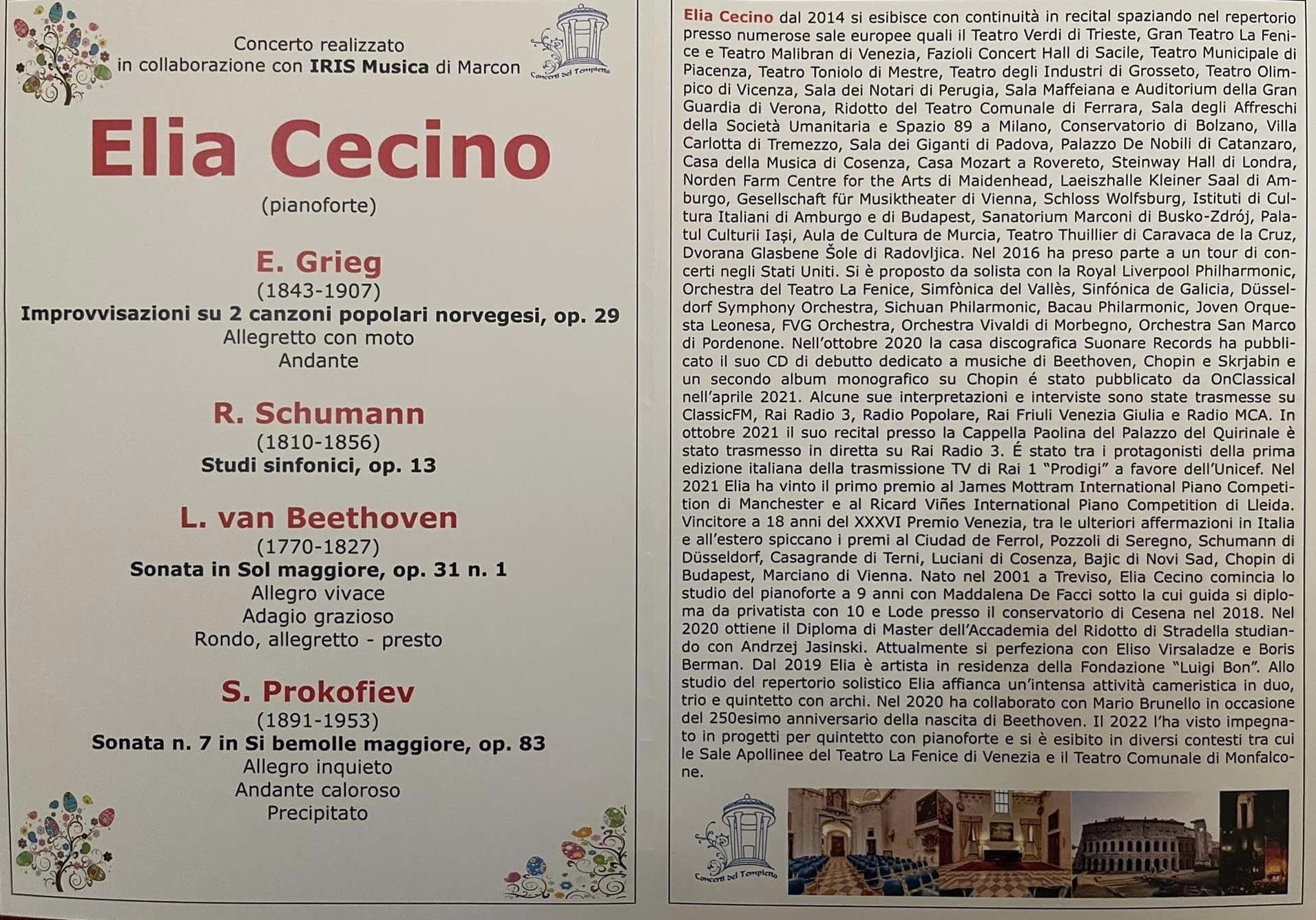 Refined musicianship and authority were the hallmark of a remarkable recital by Elia Cecino in the Tempietto courtyard in the centre of Rome.Three masterworks played with an architectural sense of line and total mastery that belied his 22 years.His annual recital has been a highlight of the Music Festival of the Nations since his first appearance here at the age of thirteen.Winner of many accolades the latest of which in New Orleans where he won first prize that leads to many appearances with major American orchestras .
