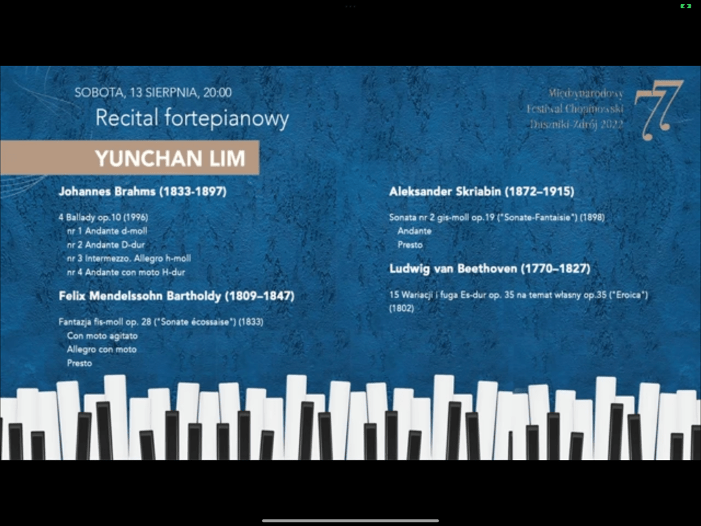 The four Ballades op 10 by Brahms were dated 1854 and were dedicated to his friend Julius Otto Grimm.Their composition coincided with the beginning of the composer’s lifelong affection for the pianist and composer Clara Schumann ,who was helping Brahms launch his career. They are arranged in two pairs of two, the members of each pair being in parallel keys.The first ballade was inspired by a Scottish poem ‘Edward’ found in a collection Stimmen der Völker in ihren Liedern compiled by Johann Gottfried Herder .It is also one of the best examples of Brahms’s bardic or Ossianic style where its open fifths, octaves, and simple triadic harmonies are supposed to evoke the sense of a mythological past. D minor. Andante D major. Andante B minor. Intermezzo. Allegro B major. Andante con moto The tonal center of each ballade shows the inter relationship between them: the first three each include the key-signature of the ballade that follows it. The first Ballade was beautifully balanced ,deeply contemplative and movingly shaped and was an opening statement of great weight.His supreme sensitivity and control gave a poignant sense of melancholy from the very first notes.His magic sonorities excluded any hardness as there was a richness to the sound of string quartet quality.A truly passionate climax that dissolved into a very delicate legato return of the opening but this time with a staccato accompaniment in pianissimo showing an unbelievable tour de force of tonal control.The second Ballade opened with a melodic line of liquid beauty played with great sensibility and shape contrasting so well with the velvet richness of the chords that followed .All played with a wonderful flexibility and sense of colour of someone who was listening to every sound he produced.Could the return of the opening melody have been more ravishing than in the hands of this teenager?Pure magic! The third Ballade brought a complete change of character with a demonic sense of rhythmic energy full of menace and the unexpected.Contrasting with the heavenly sounds on high with the bell like call (similar to Le Gibet) creating a truly magic atmosphere.The fourth Ballade entered as a whisper of such sublime beauty and the searing intensity of the central section was almost unbearable in it’s subtle emotional impact . The return of the opening theme was even more ravishing with a staccato left hand that showed a phenomenal technical control as this young man listened so intensely – Je joue-je sens-je trasmet – an apparition that was unforgettable Mendelssohn was among many nineteenth-century German composers, among them Beethoven, Schubert, Schumann, Brahms and Bruch, who were fascinated by Scotland, by its folk music, history and literature. Mendelssohn was the only one of these six who visited Scotland, when at the age of twenty during the summer of 1829 he found the inspiration for his Scottish Symphony at Holyrood Chapel in Edinburgh and for the ‘Hebrides’ Overture (also known as the ‘Fingal’s Cave’ Overture) on the desolate island of Staffa off the coast of Mull in the Hebrides. But well before he made his celebrated walking tour of Scotland in 1829, he was reading the poetry and novels of Sir Walter Scott, and was acquainted with the ‘Ossianic’ poems. In the early 1820s he composed two settings of verses from Scott’s epic poem The Lady of the Lake (including the Ave Maria, also set by Schubert). Then, probably in 1828 or early 1829, the young composer attempted his first full-scale work inspired by a Scotland he had not yet seen or experienced. The three-movement Fantasia in F sharp minor, Op 28, eventually released in 1834, took shape originally as a ‘Sonate écossaise’, mentioned already in family correspondence from early 1829. Four years later, early in 1833, Mendelssohn revised the work, still titled ‘Sonate écossaise’, but then published it the following year as a Fantasia, without its Scottish attribution. The three movements are con moto agitato-Andante,Allegro con moto,Presto. An opening flourish that linked Brahms to Mendelssohn with such ‘fantasy’ leading to the Andante played with great sensibility and ravishing beauty interspersed with shimmering cascades of notes.Contrasting so well with the quixotic rhythmic energy of the Allegro con moto before the scintillating virtuosity of the Presto. Not since Serkin or Perahia have we heard Mendelssohn restored to his rightful place with the seriousness of a great interpreter and not the usual heart on sleeve note spinner!Scriabin’s Sonata n. 2 op 19, also titled Sonata-Fantasy took five years for him to write. It was finally published in 1898, at the urging of his publisher. The piece is in two movements Andante and Presto. The precedent of Beethoven’s ‘Moonlight’ Sonata allowed Scriabin the luxury of an opening slow movement to his Second Sonata, whose programme reads thus: “The first section represents the quiet of a southern night on the seashore; the development is the dark agitation of the deep, deep sea. The E major middle section shows caressing moonlight coming up after the first darkness of night. The second movement represents the vast expanse of ocean in stormy agitation.”The opening was barely audible with a wonderful sense of legato where Scriabin’s golden and silver strands united in a melodic line of luminous radiance.The rhythmic energy and passion he brought to the second movement were breathtaking in their sweep and conviction.The Variations and Fugue for Piano in E♭ major, Op. 35 are a set of fifteen variations for solo piano composed by Beethoven in 1802.Known as the Eroica Variations because a different set of variations on the same theme were used as the finale of his Symphony n.3 Eroica composed the following year.Beethoven opens the work not with the main theme, but the bass line to the main theme. He then follows with three variations of this bass line before finally stating the main theme