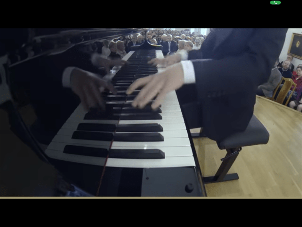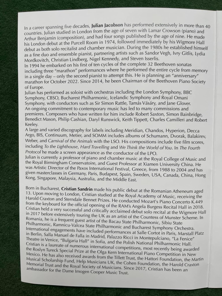 Mozart’s late C major Sonata was played with the grace and charm that makes him if not the greatest composer certainly the most perfect -to use Julian’s own words .The Mozart Sonata K.521 was the last of his four hand sonatas and was dated May 29, 1787 just 4 years before his untimely death in in 1791,aged 35.On the same day in 1787 he also received word of his fathers death. Mozart then shared the sad news with his close friend Gottfried von Jacquin, a Viennese court official and amateur musician, and subsequently dedicated the sonata to Gottfried’s sister, Franziska von Jacquin.In Mozart’s letter to Gottfried, he noted that the sonata is “rather difficult” and therefore instructed Franziska to “tackle it at once”.Instead of Mozart’s original intention to dedicate it to Franziska von Jacquin, one of his most talented pupils, it was finally dedicated to Nanette and Barbette Natorp,daughters of Viennese businessman Franz Wilhelm Natorp.It was the absolute precision that they brought to this ‘rather difficult’ sonata that was remarkable for it rhythmic drive and absolute clarity.Cristian’s beautiful way of allowing the music to flow so naturally from his hands with his particular way of playing trills from above and Julian’s superb musicianship that created just the overall tonal palette that was both dramatic and elegant.The vehemence of the opening dissolving into the absolute charm of the following melodic outpouring.The melancholic beauty of the Andante and it’s overpowering central section were played with great intensity contrasting so well with the simple music box type recurrence of the rondo.It was played with a disarming simplicity and elegance as this already distinguished duo partnership were at one before such genius.
