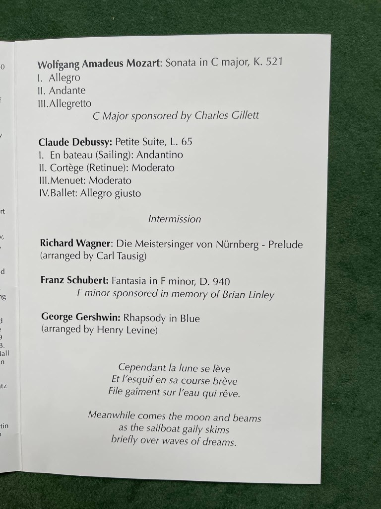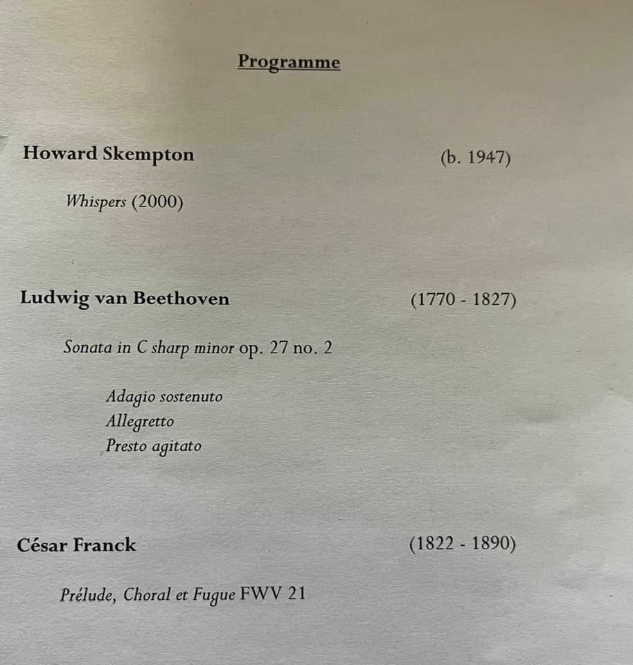 Today there were some very musicianly performances on a new Yamaha piano and although a change of programme brought us ‘Moonlight’ – in the bright sunlight as the pianist very spiritedly pointed out – it suited this short programme rather than the announced ‘Appassionata!’ Cesar Franck,after all,was given the just importance for the 200th anniversaryof his birth. ‘Moonlight’was not Beethoven’s title but his publisher trying to make another sonata more sales worthy. Beginning unusually with an Adagio and as Beethoven points out these two sonatas op 27 do break the standard Haydnesque model and are presented as Sonatas ‘quasi una fantasia’ .The start of an evolution that was to take us into the realms of the Gods at the end of Beethoven’s long journey to the final trilogy ending with op 111. It was this sense of ‘fantasia’ that was missing today with playing of great solidity and clarity where Beethoven specifically indicates by tempo and pedal marking that the melodic line should shine above a shimmering accompaniment – hence obviously the title ‘Moonlight.’It was beautifully shaped and flowing though and Viv McLean is in the company of many illustrious musicians who choose a more classical approach.I do remember though,Andras Schiff’s opening gambit in a masterclass at the RCM where he told Pavel Kolesnikov “ now let’s forget this ‘moonlight’ thing”. https://youtube.com/watch?v=85KJkpbh_us&feature=share. The Allegretto was played with the same admirable classical musicianship but the fast tempo was rather breathless and devoid of charm and elegance.It was in the Presto agitato that the pianist came into his own with a drive and dynamic energy that was breathtaking and showed his unrelenting classical approach and seriousness in an often much abused work.