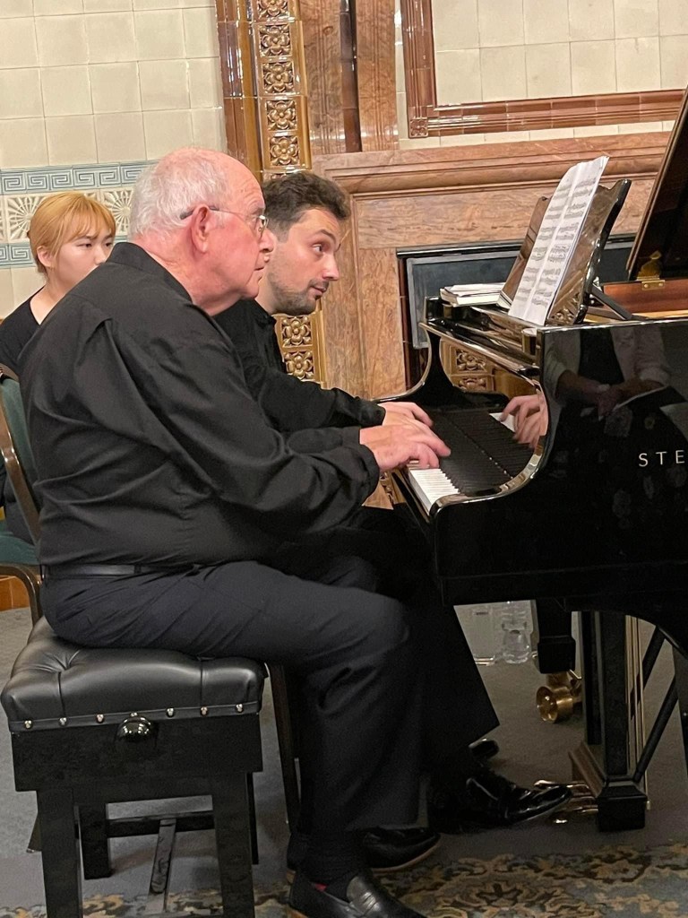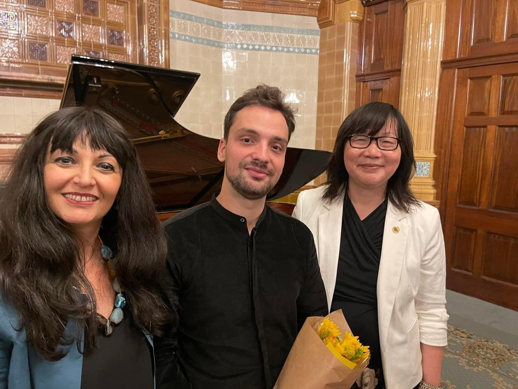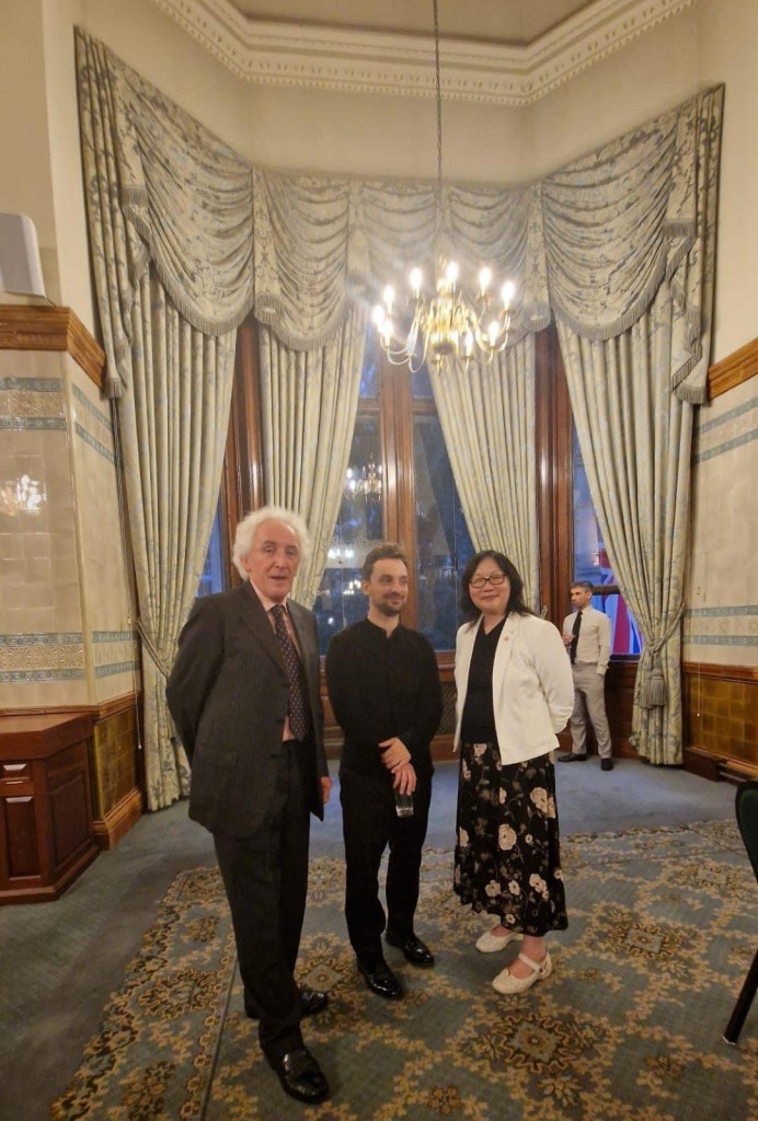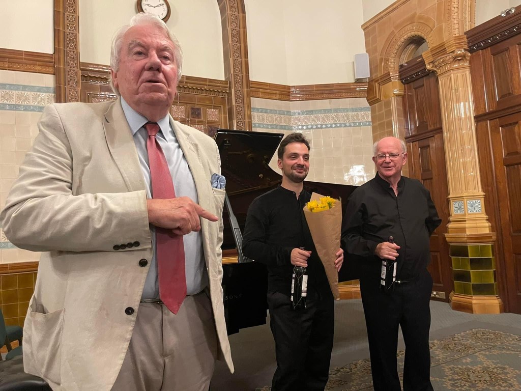 The indomitable Peter Whyte,chairman of the Kettner Society presenting the artists with a very special bottle of Rioja wine ……..Viña Bujanda Reserva 2017 RIOJA DOCA Innovative, cutting-edge masters of their art, the Bujanda family don’t compromise on quality; it shows in their huge haul of awards. This is their lavish Reserva – two years in cask and one in bottle brings together intense fruit and toasty oak………..Sunday Times listed Not asleep but listening intently to each other – the key mark of a superb duo partnership Cristian Sandrin with Christopher Axworthy of the Keyboard Trust The National Liberal Club – Whitehall Place The extraordinary Yisha Xue and friend with flowers for fellow club member Cristian SandrinAnniversary celebration at the National Liberal Club on the 13 September with the presentation of the book ‘The Gift of Music’ written by John Leech,the 97 year old founder of the KCT.It will be presented by its honorary patron : Sir Antony Pappano who will perform together with Leslie Howard,Sasha Grynyuk,Michail Lifits,Chloe Jiyeong Mun,Jayson Gillham,Pablo Rossi,Vitaly Pisarenko in an evening of a celebration in music.