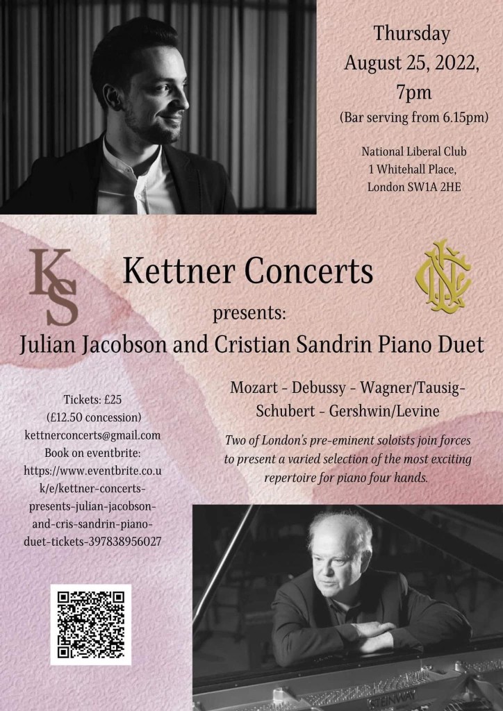 Hausmusik or the joy of making music together produced a magical evening at the National Liberal Club with Cristian Sandrin and Julian Jacobson. Joining forces for an imminent cruise that will see them in six performances together whilst sailing from Southampton to Canada and finishing in New York.