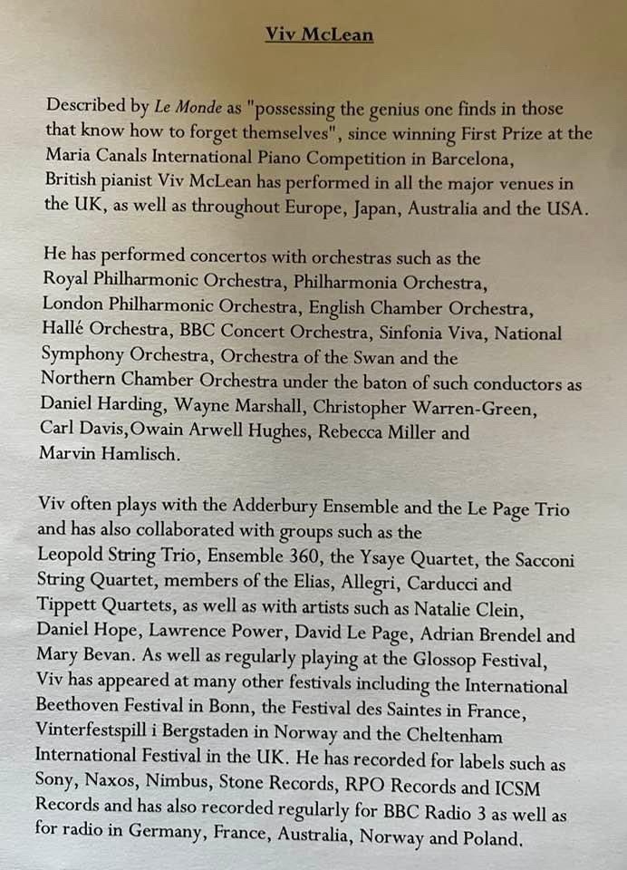 Viv McLean has a very impressive curriculum from when he won first prize in the much coveted Maria Canals International Piano Competition and it was his capacity to give such clarity and architectural shape to all he played that was quite remarkable.