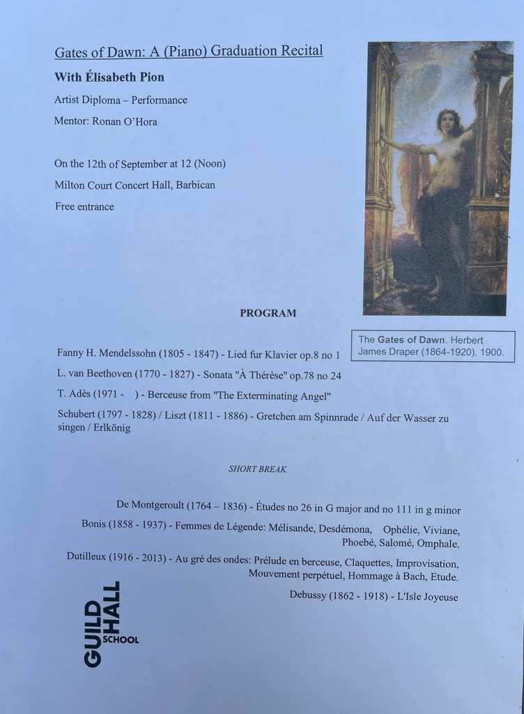 Liebestraum was played with aristocratic poise and poetic style.Gretchen too showed her kaleidoscopic sense of colour and a technical prowess that allowed her to caress the notes even in the moments of most fervent passion.The B flat minor Sonata was played as a true musician – one with a heart that beats intensely.It was,though,the Trio of the Funeral March that took our breath away for it’s timeless beauty (especially as we had just heard the brass band play it in marching time as the guardsmen accompanied their Queen on her final journey through the streets of London).There were truly wondrous colours in the last movement as we could almost feel the wind blowing over the graves.And after all that puffing and blowing what aristocratic poise she gave to the final great chords of rich vibrancy.It was the radiance and ‘joie de vivre’ of Chopin’s variations op 2 that left us breathless and mesmerised.The work that Schumann was to describe on Chopin’s first appearance in the Paris Salons with ‘Hats off a genius’.Here was the radiance and style of jeux perlé thrown of with an ease and elegance by Aleksandra.A show piece like Liszt or Moscheles but already with the aristocratic refined taste of the genius of Chopin.