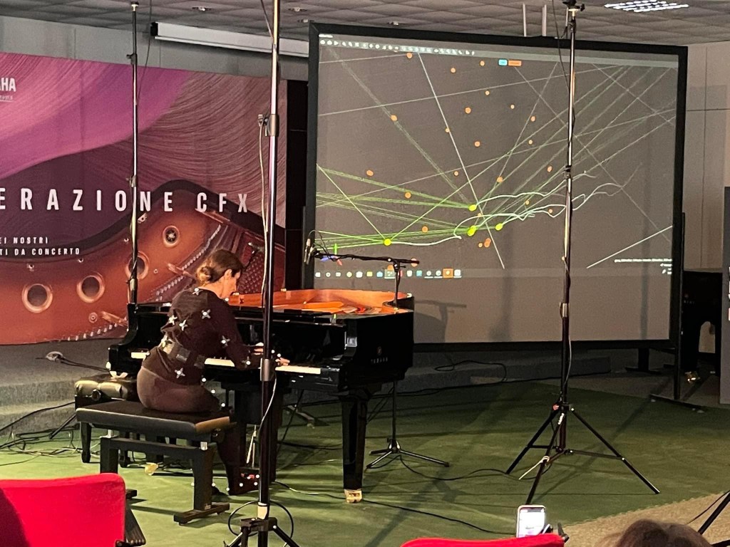 In the second part of the performance,she played in dialogue the avatar, detected by the motion capture system, the piece Piano Phase for two pianos by Steve Reich (1936).