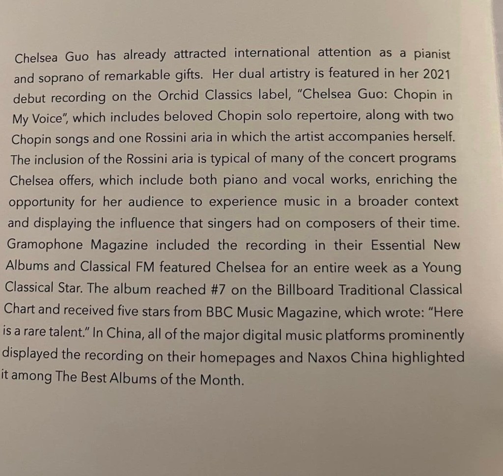 She chose to open with one of Chopin’s last works and finished with one of his first and in between his large scale masterpiece that is the B flat Sonata Sonata op 35.She also included Liszt’s Liebestraum n.3 strangely neglected these days and also included Liszt’s ravishing transcription of Schubert’s Gretchen am Spinnrade ( a work that we were to hear in this same hall when Chelsea Guo also sang Goethe’s words from Faust).Many consider the Barcarolle Chopin’s most perfect work .It is an outpouring of song of sublime poetical inspiration.I remember Janina Fialkowska playing it in a commemoration for my wife and coming off the platform she whispered in my ear :’That was Ileana’…….there could not have been a more moving tribute to one of Italy’s most loved dramatic actresses.Aleksandra played it with sumptuous tone from the very first bass C sharp.So often a call to arms instead of the magic opening of a box of jewels which Aleksandra opened to perfection.If later she allowed her emotion to show above rather than in the notes what could one say when it is obvious that she loves it so deeply.The simplicity or distilling emotion into the very core of the notes will come like Rubinstein with living and loving the work for a lifetime.