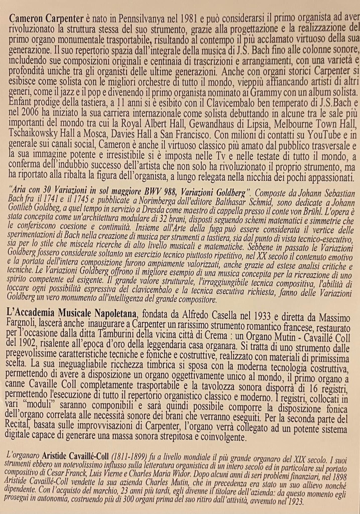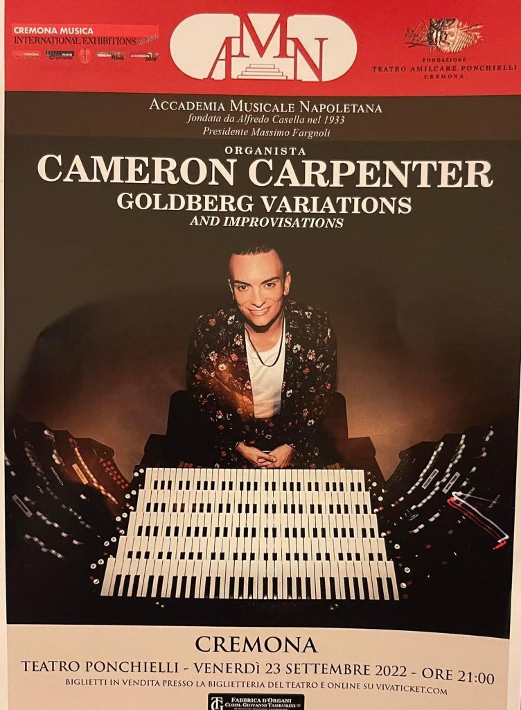 The chase was now on to catch up with the meeting of Cameron Carpenter and to hear his thoughts on the Goldberg Variations that he was to perform in the evening in Teatro Ponchielli.He was presented by Massimo Fargnoli the president of the Accademia Musicale Napolitana and defender of the great Neapolitan keyboard school amply displayed in his temporary temple of the Sala Guarneri.