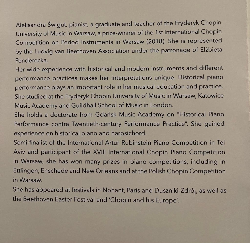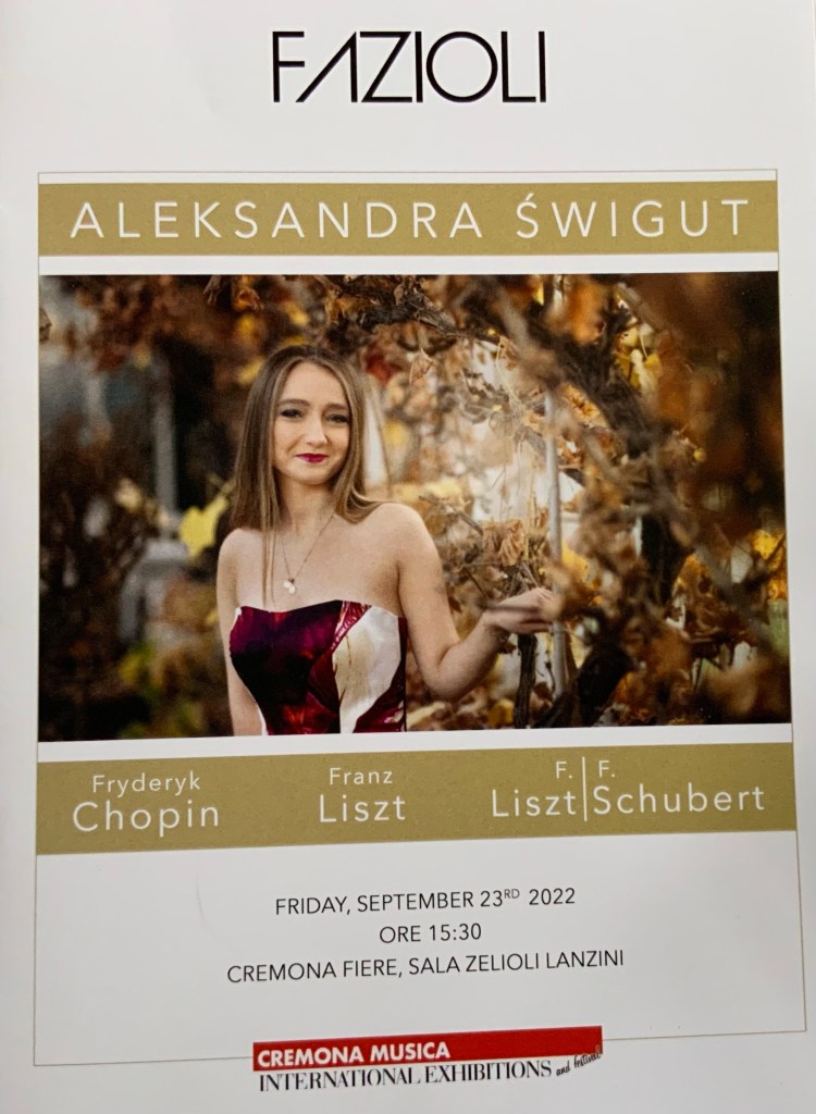 Now the race was on to hear Aleksandar Swigut in the Fazioli Piano Festival.I had heard her recently in the final of the Grieg International Competition where she was a top prize winner with a very deeply felt performance of Chopin’s E minor concerto.It had been framed in the final on either side by the Grieg Concerto which only made one more aware of how much the slow movement is inspired by Chopin’s concertos.