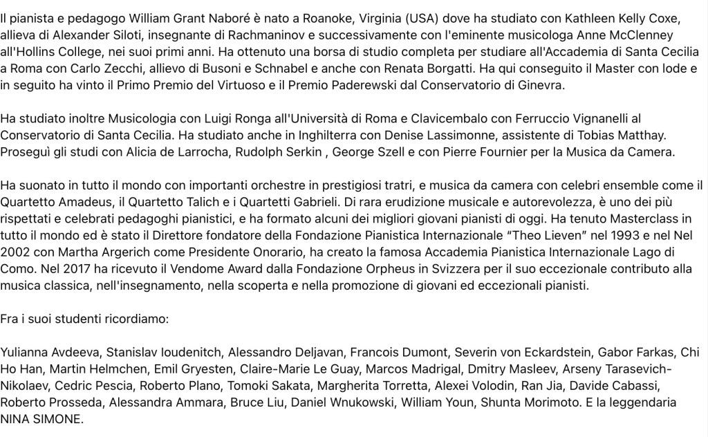 A very interesting discussion from the psychology of digital platforms ,through the possibility of teaching on line only if you know the student personally beforehand and Ben Laude’s Tone base archive of masterclasses available on line.Jed Distler joining in the debate from the confines of his hotel room and added his own fascinating ideas.It was however the discussion between teacher and pupil William Naboré ( of the International Piano Academy Lake Como) and ex student Roberto Prosseda that was most stimulating and was carried over later into the presentation of the CD box of Naboré. Really a testimony of a life in music and I think as far as we will ever get with an autobiography as this octogenarian is still far too dedicated to the future than waste time on the past !