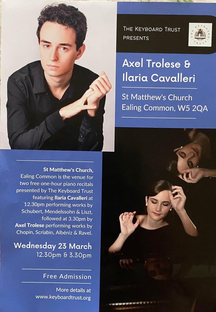 St Matthews was again the venue for two young musicians series.This time for two Italian pianists Ilaria Cavalleri and Axel Trolese both recorded for eventual streaming on web site https://christopheraxworthymusiccommentary.com/2022/03/24/ilaria-cavalleri-in-london/ https://christopheraxworthymusiccommentary.com/2022/03/24/axel-trolese-in-london/