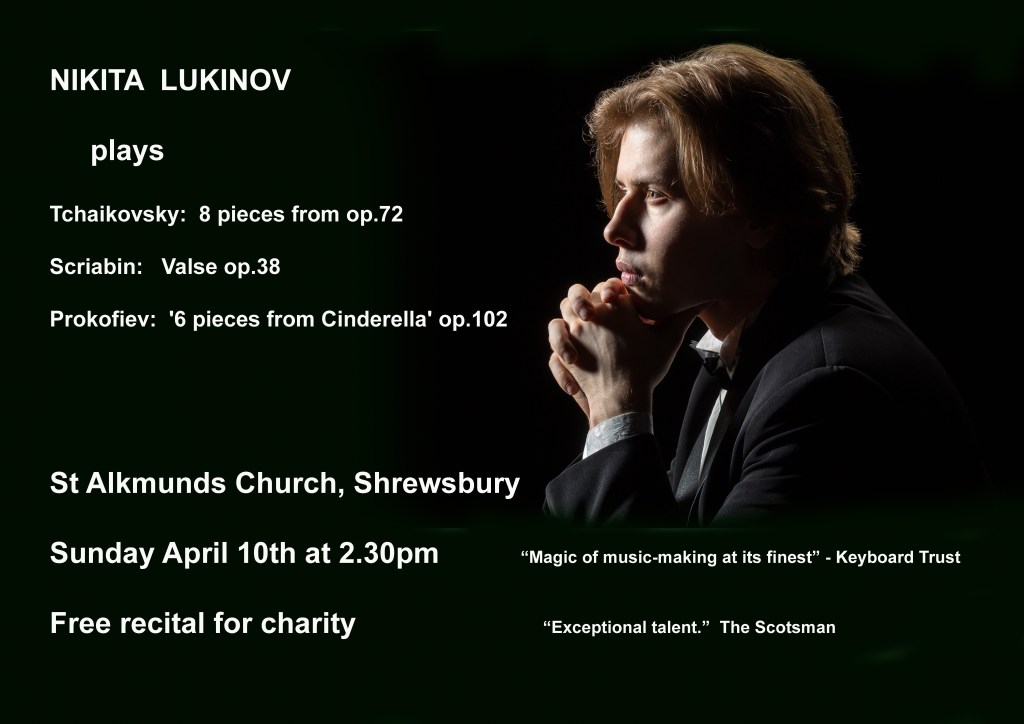 On the 10th April Nikita Lukinov played a benifit concert for Ukraine in Shrewsbury.He played a few days later in Perivale that I was able hear :https://christopheraxworthymusiccommentary.com/2022/04/11/nikita-lukinov-at-st-marys-a-masterly-warrior-with-canons-covered-in-flowers/