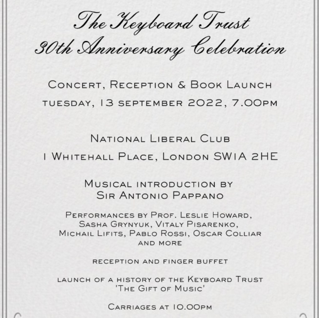 The presentation of the Gift of Music – a celebration of 30 years of the Keyboard Trust will take place at the National Liberal Club on the 13th September .It will be presented by the honorary patron Sir Antonio Pappano who will perform together with Leslie Howard and other artists from the Keyboard Trust illustrious roster including the recipient this year of the Weir Trust Award