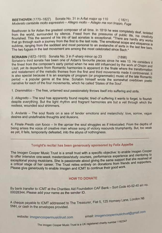 Aidan Milkdad a name to remember ……astonishing playing for the Imogen Cooper Music Trust.A Liszt Sonata of such clarity and assurance with an architectural understanding that made you almost forgive his youthful passion that ignored Liszt’s very specific dynamic instructions. But there were so many memorable things that when he has had a serious talk with Dame Imogen he will understand that there can only be one climax that must be the very pinnacle of the sonata. The tumultuous and overpowering climax before the return of the deep mysterious opening chords.He played the fugato at breakneck speed too (because he can!) and then of course he had to put the break on.There were so many beautiful things though and a technical ease that allowed such clarity.The opening with its murmured mystery so beautifully shaped and that reached sublime heights in the final bars when Aidan hinted at a dissonance so unexpected but for that so moving.As Ashkenazy once said,the final two pages of Sonata are some of the most moving in all of music.It was after all the spectacular gymnastics that this young man had understood that these final pages were the very core of this masterpiece and he was able to reveal it’s soul as only a kindred spirit could do.No wonder Liszt scratched out his triumphant first draft for the sonata where like Busoni with the Goldberg variations it finished in a blaze of glory.The genius of Liszt was able to pen one of his most moving utterances that pointed to the future.The Genius of Liszt has no bounds.Q.E.D.