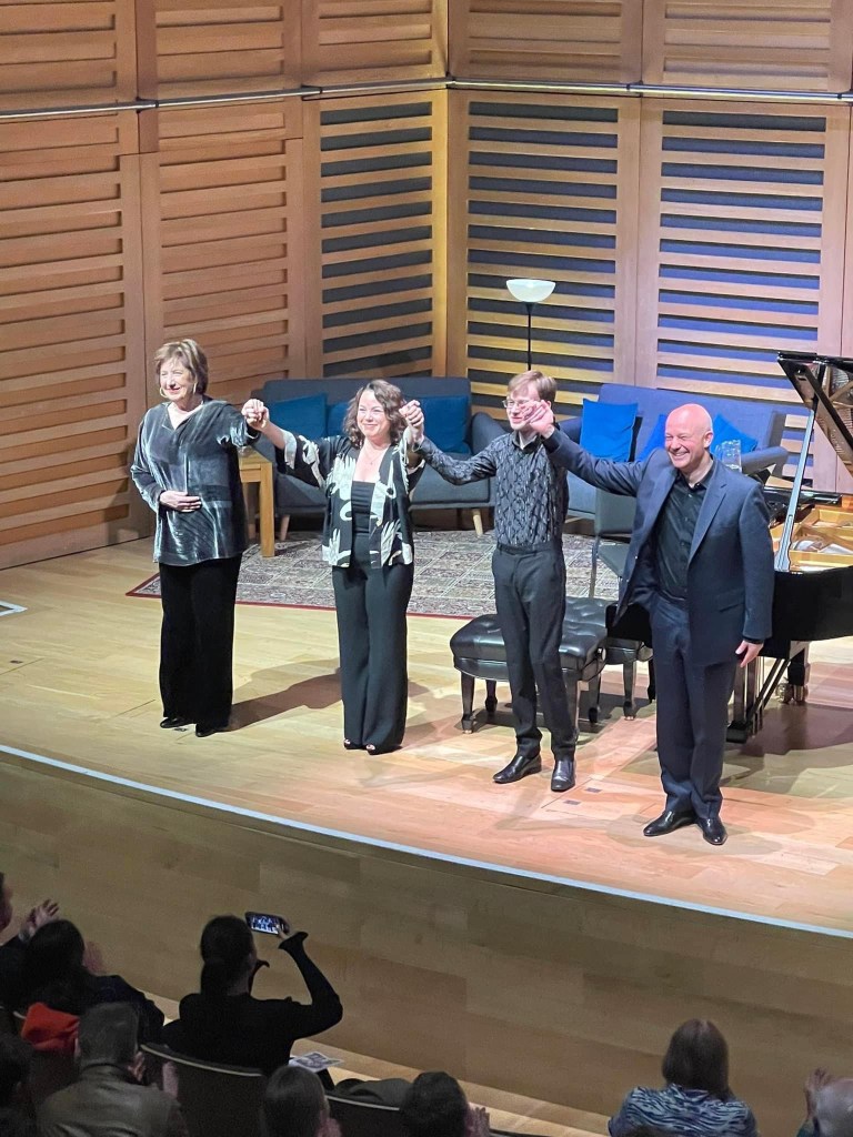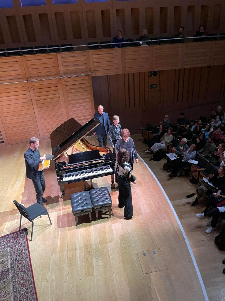 Madame O’Shea saluting Marios Papadopoulos with concert manager Lisa Peacock and Pilar Pertusa,general secretary of the Santander Competition