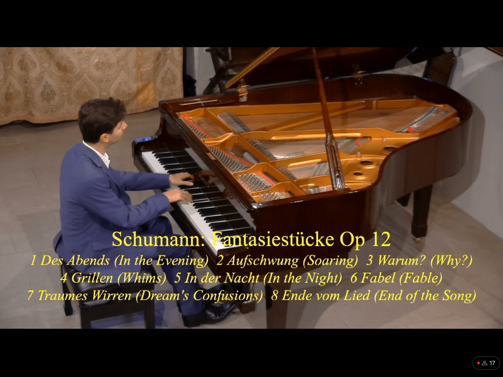 The ravishing half shades of ‘Des Abends’ contrasted with the passion and drive of ‘Aufschwung’ with its sumptuously rich sweeping melodic line.Beguiling balance and subtle beauty of ‘Warum’ contrasted with the rumbustuously innocent rhythmic energy of ‘Grillen’.A sweep of soaring intensity in ‘ In der Nacht’ with a deeply moving moving central episode before the wind builds up again with even greater passionate intensity.The almost too serious ‘Fabel’ with its wonderfully capricious comments .There was great clarity and technical assurance in ‘Traumes Wirren’.But it was the majestic nobility of ‘Ende vom Lied’ that was so movingly portrayed as it gently disintegrated before our very eyes with a stillness as though recalling distant dreams . Some remarkably vivid story telling from a true artist