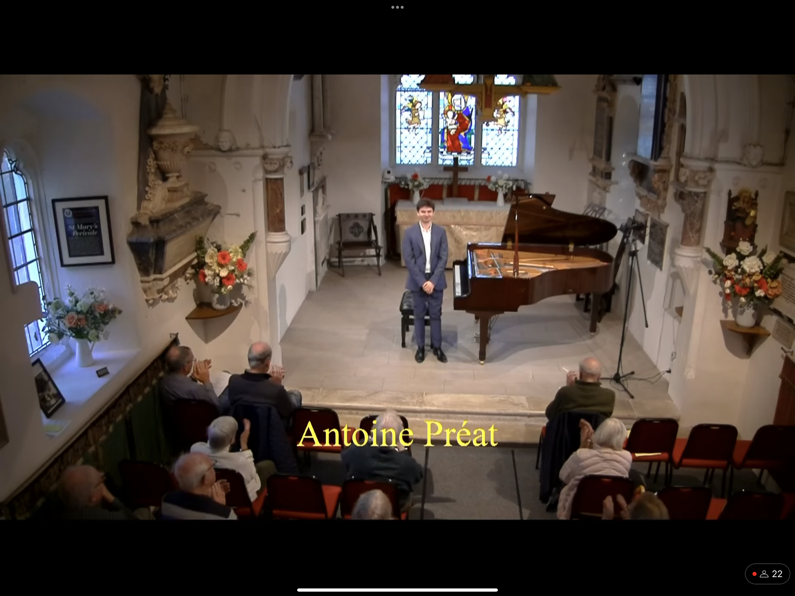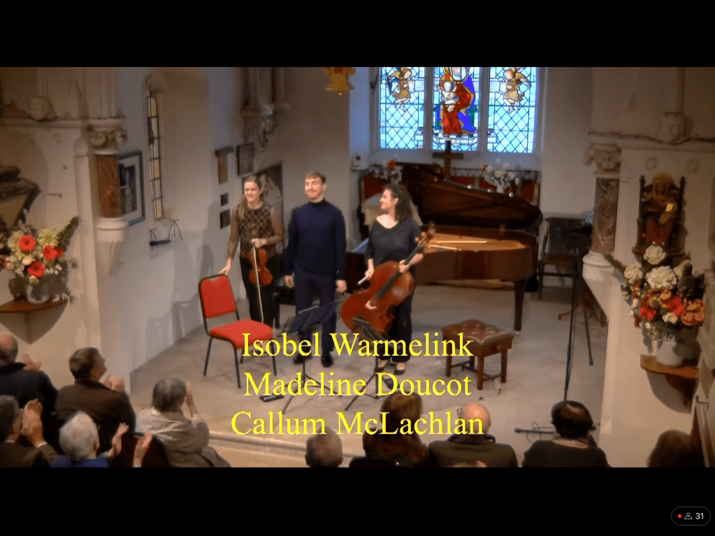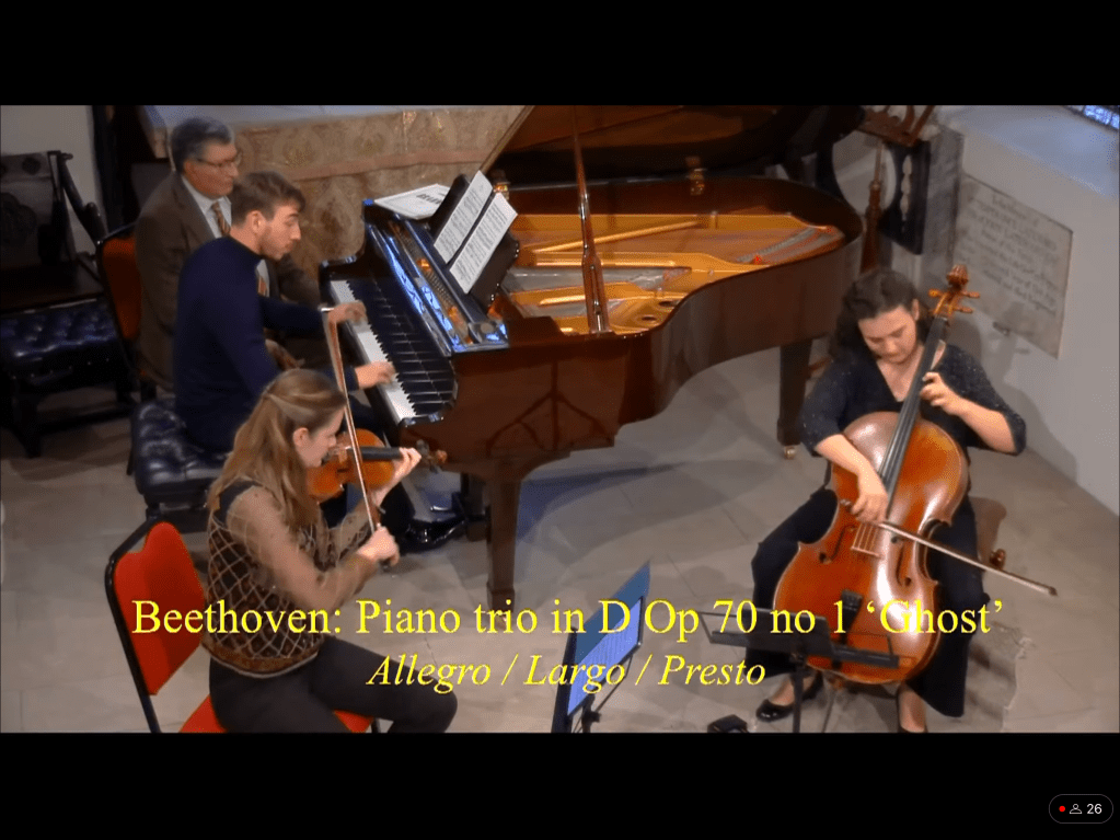 Fresh from the Kew Academy having flown in from Salzburg where as students they met and have now created a superb trio. Perivale was full to the rafters to hear two of the great masterpieces for piano trio by Beethoven and Brahms. Living and rehearsing together in Kew prior to their tour which has included Manchester London and tomorrow Amsterdam.Madeline not only plays the cello divinely but she has the same love for cooking and the house has been ringing with music and the most wondrous smells from the kitchen.Callum is a dab hand at the computer and Isobel loves to practice and keep us all in order. It is only experiencing life together that a trio can come alive as it did today with each one knowing instinctively what the other might do.Like the cat chasing the mouse ,waiting and watching ready to pounce.Each one a master of his or her instrument.The piano lid fully opened because Callum is a good driver who knows where he is going and Madeline sits in the curve of the piano knowing that the wooden lid will reflect her beautiful cello playing without any forcing.Isabel coming into her own playing in perfect harmony with her two friends.Some extraodinarily luminous playing from Callum taken over by the soaring passion of Isabel and Madeline in the sublime Brahms trio. Bringing the same meditative mystery to the Brahms Adagio that they had brought to the whispered Largo of the ‘Ghost’trio.What energy there was in the Allegro of the Beethoven and the sheer joy at the end of the first movement of the Brahms was exhilarating. Hugh Mather has hit the nail on the head when he says St Mary’s is the ideal venue for chamber music as was proven today by a packed house listening in rapt attention to these three wonderful young players.I bet Hugh Mather is watching in from home too where he is on family duties with a well earned rest from the hundreds of concerts that he presents every season. Roger Nellist was the expert presenter today having come down from his perch in the video studio to share in the fun we were all having on stage.