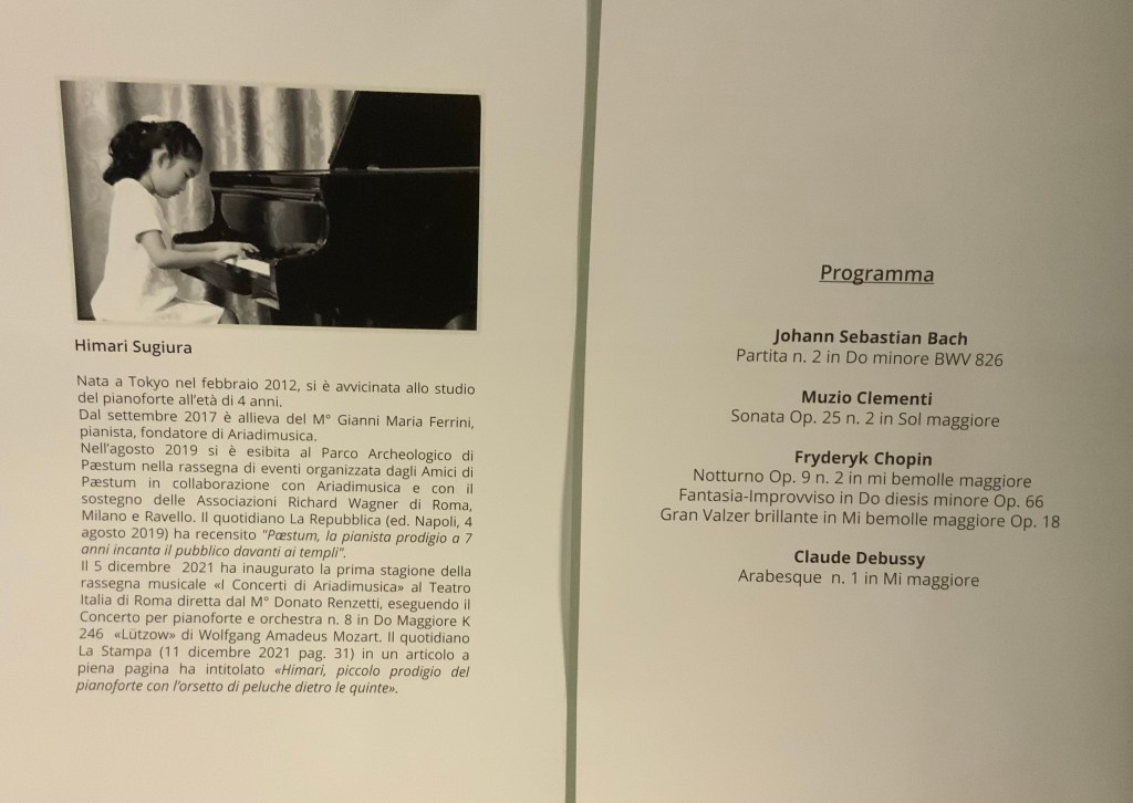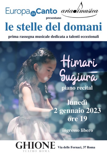 Le nostre due realtà hanno come obiettivo quello di diffondere la cultura artistica e musicale tra le nuove generazioni, lavorando con e per i giovani. Presentiamo quindi insieme la prima rassegna musicale dedicata a talenti eccezionali. In apertura la giovanissima pianista giapponese Himari Sugiura allieva del M° Gianni Maria Ferrini ad Ariadimusica dall’età di 4 anni. A 7 anni si è esibita nella meravigliosa cornice del Parco Archeologico di Paestum e a soli 9 anni ha eseguito il Concerto per pianoforte e orchestra K 246 di Mozart diretta dal M° Donato Renzetti al Teatro Italia di Roma.