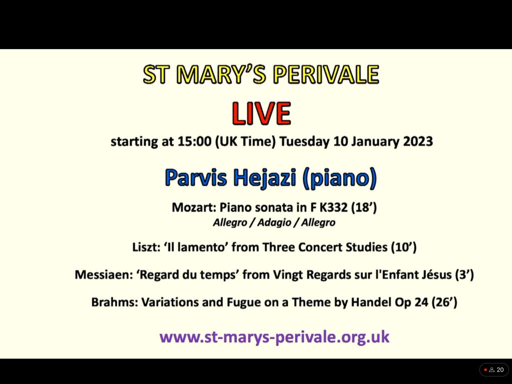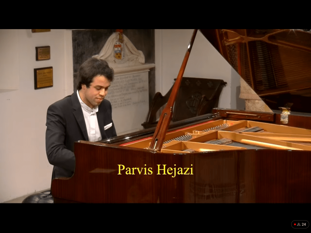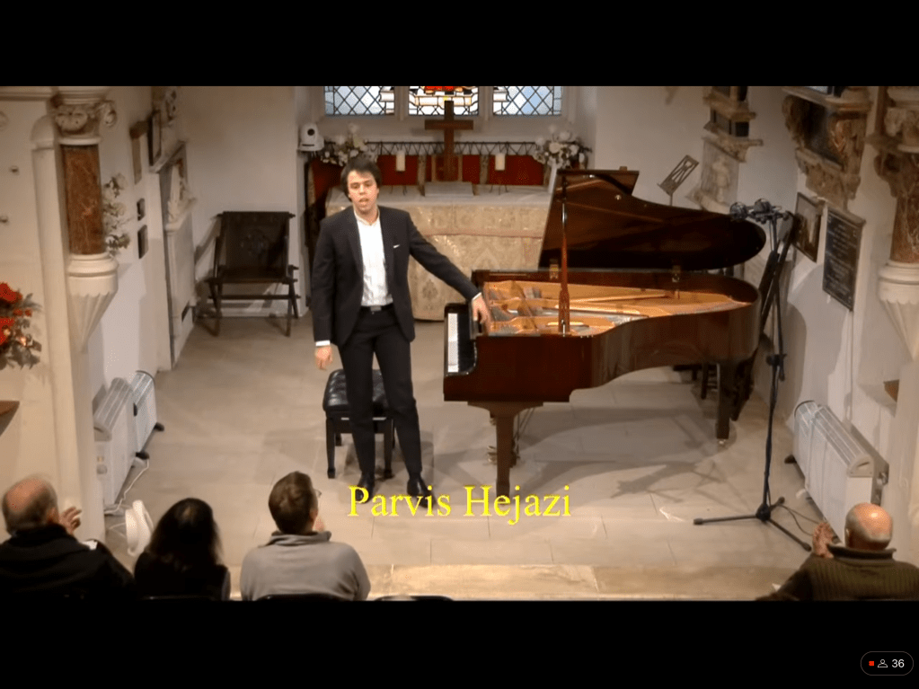 Some superb playing from a poet who not only has a heart but also a mind as you would expect from the school of Norma Fisher. A Mozart of a clarity and sense of character but with a rhythmic precision and buoyancy that brought this well known sonata vividly to life.The characters entered and exited from the stage in what is a superb operatic scenario. It was a great operatic sweep he also brought to Liszt’s all to rarely heard ‘Lamento’.It was played with a sense of style and just the right amount of showmanship that could bring this beautiful piece vividly to life.The delicacy he brought to the final few bars was most touching after the passionate outpouring that had preceded it with a sumptuous sound and refined sense of balance. There were chiselled sounds of great beauty in Messiaen’s contemplation.Pungent harmonies and atmospheres with the intensity of a fervant believer. The first performance I ever heard of Brahms Handel Variations was from Parvis Hejazi’s teacher Norma Fisher.I had been taken as a teenager by our mutual teacher Sidney Harrison to hear his star pupil in the London Pianoforte Series at the Wigmore Hall when she was already an established artists. I have never forgotten that performance of such warmth and nobility and an astonishing transcendental command of the structure of this almost orchestral work. Parvis gave a remarkable performance of simplicity and dynamic drive.Shorn of all rhetoric it was a young man’s performance – Brahms was after all only 28 when he wrote it for his beloved Clara’s birthday. Of course from Norma Fisher he had learnt the importance of the bass and each variation grew out of the other with this never wavering anchor that he had created.A technical command that was astonishing for a live performance and a clarity that was not ‘Brahmsian’- thank God! The sheer beauty of his playing and unwavering command was quite remarkable as Handel’s innocent little melody was transformed into an outpouring of Busonian proportions.Spurred on into the fugue by this driving undercurrent that he had created he brought this masterpiece to a breathtaking conclusion. Visibly exhausted as we all were he was happy to share his own beautiful Messiaen like piece with an enthusiastic audience. ‘After the magnificat’ showed the same fervent conviction of a true believer with magic sounds the melted into a cherished distance of oblivion and peace.