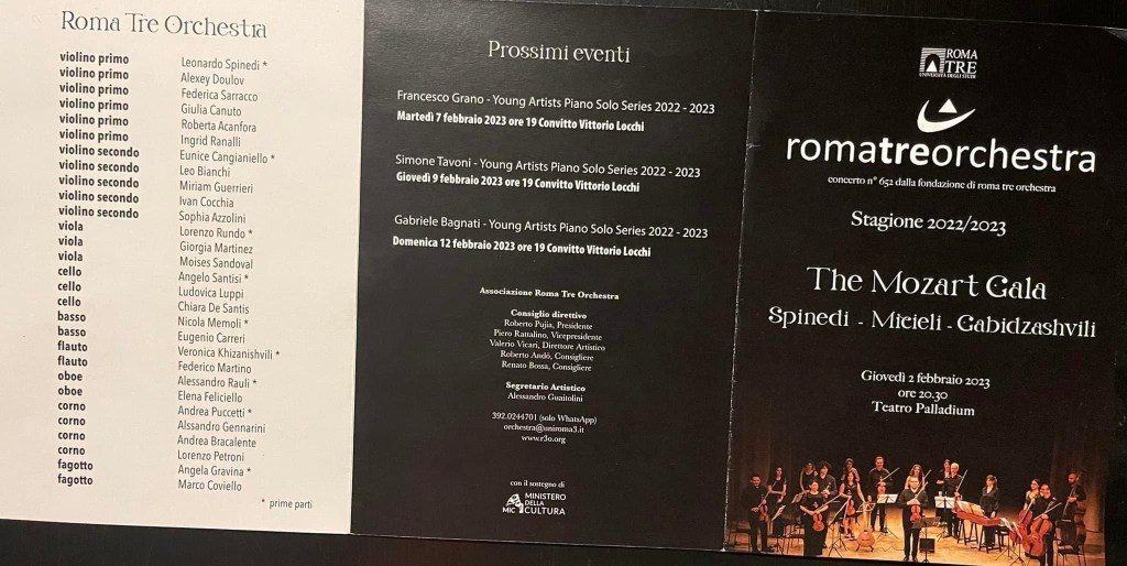 It was Rubinstein who quipped that Tureck makes Bach box office and I think we can say judging from the full house at Teatro Palladium that Valerio Vicari makes Mozart box office too .Valerio Vicari,the artistic director of the Roma Tre Orchestra and concert season at the University where he too was a student under Prof.Robert Pujia.Together with the help of the University they have created over the past twenty years a reality that is proving to be unique in Italy.A season for Young Artists on the threshold of starting a career in music giving concerts even during the pandemic thanks to streaming from their Teatro Palladium.Valerio is also Professor of Latin and corrected my Italian title to the more perfect Latin …….hats off indeed and many thanks for all that he is doing .