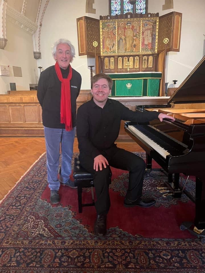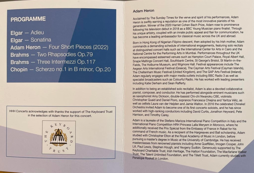 A standing ovation for Adam Heron at end of the first of a new lunchtime series in Haslemere .Organised by Stephen Dennison of Cranleigh Arts in partnership with the Keyboard Trust .A sure fire success with a full house,marvellous publicity and the superb Shegaru Kwai brought in from Cranleigh for this mini series.