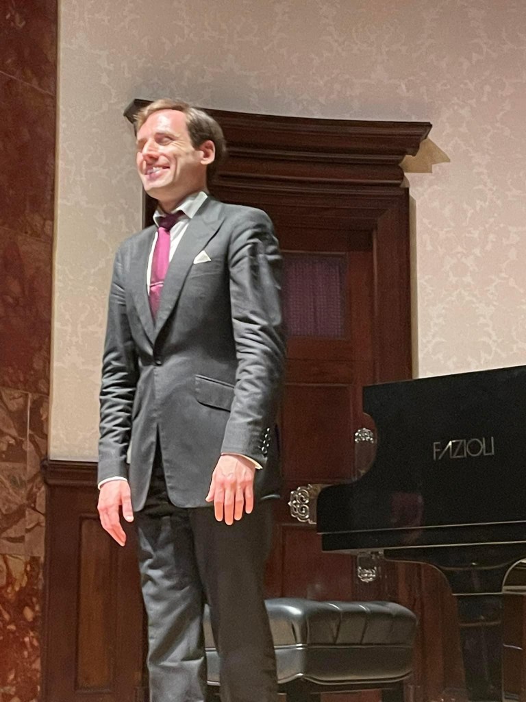 On a magnificent Fazioli piano he rarely touched the soft pedal such was his technical control.In fact the left foot was used to turn the pages of an I pad discreetly hidden inside the piano.