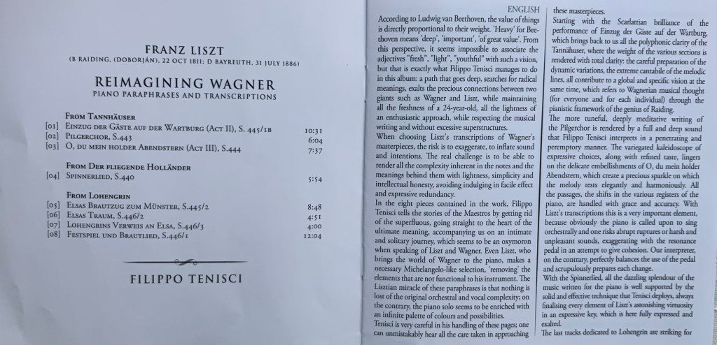Today it was an all Wagner concert alla Liszt by the young Albanian born pianist Filippo Tenisci from the class of Maurizio Baglini. https://christopheraxworthymusiccommentary.com/2021/06/24/che-festa-the-joy-of-musicmaurizio-baglini-project-at-roma-3/