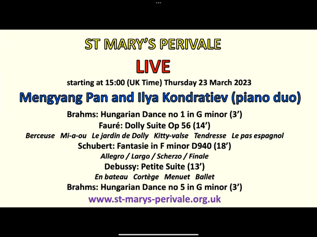 A complete concert together for two remarkable musicians who up until today had only played in various festive occasions but never had a chance to play an entire recital together.The delicacy and sensitivity of Mengyang were complimented by the musicianship and showmanship of Ilya.Both had completed their training in the class of Vanessa Latarche at the Royal College so their musical pedigree was assured.Both have now been elevated to professorships at the Royal College.Two virtuosi who have mastered much of the solo piano repertoire but have the humility and responsibility of helping young musicians.Encouraging them to put aside their newly acquired skills and to focus on listening to themselves and translating the composers wishes into sounds.A concert of duet ‘lollipops’ in the sense that they presented a programme of well known duets by great composers.It was just this that showed off their remarkable pedigree as they presented these works with a freshness and intelligent musicianship that made one realise what gems they can be in the right hands.