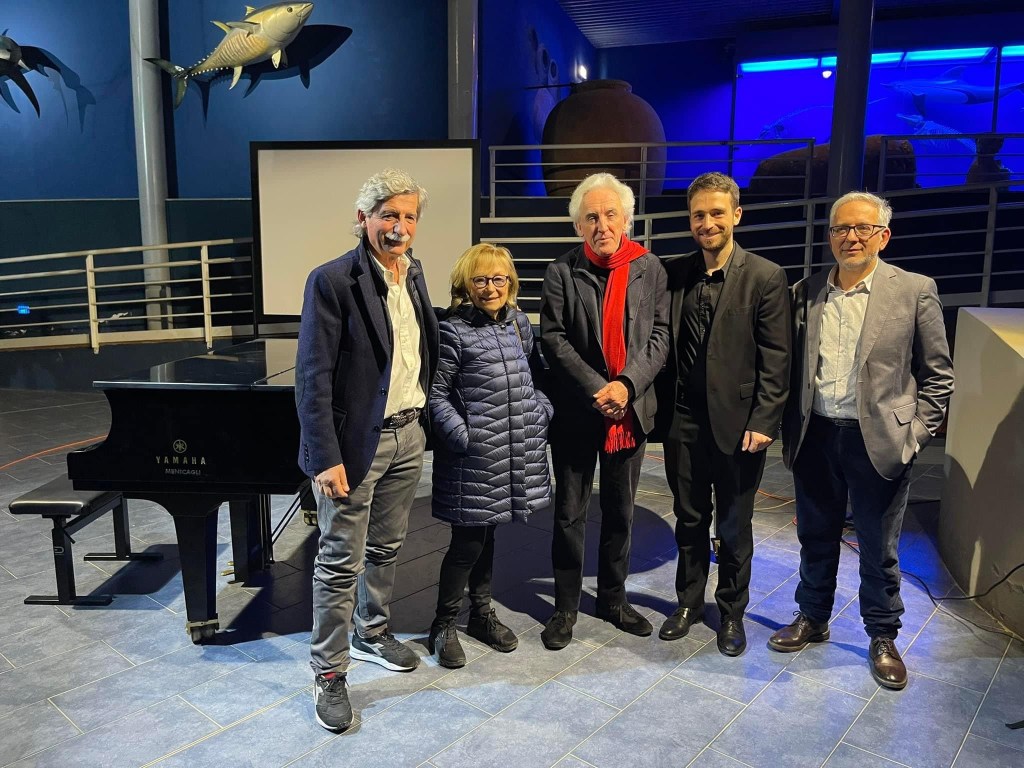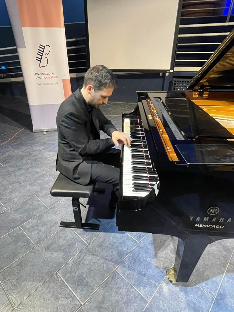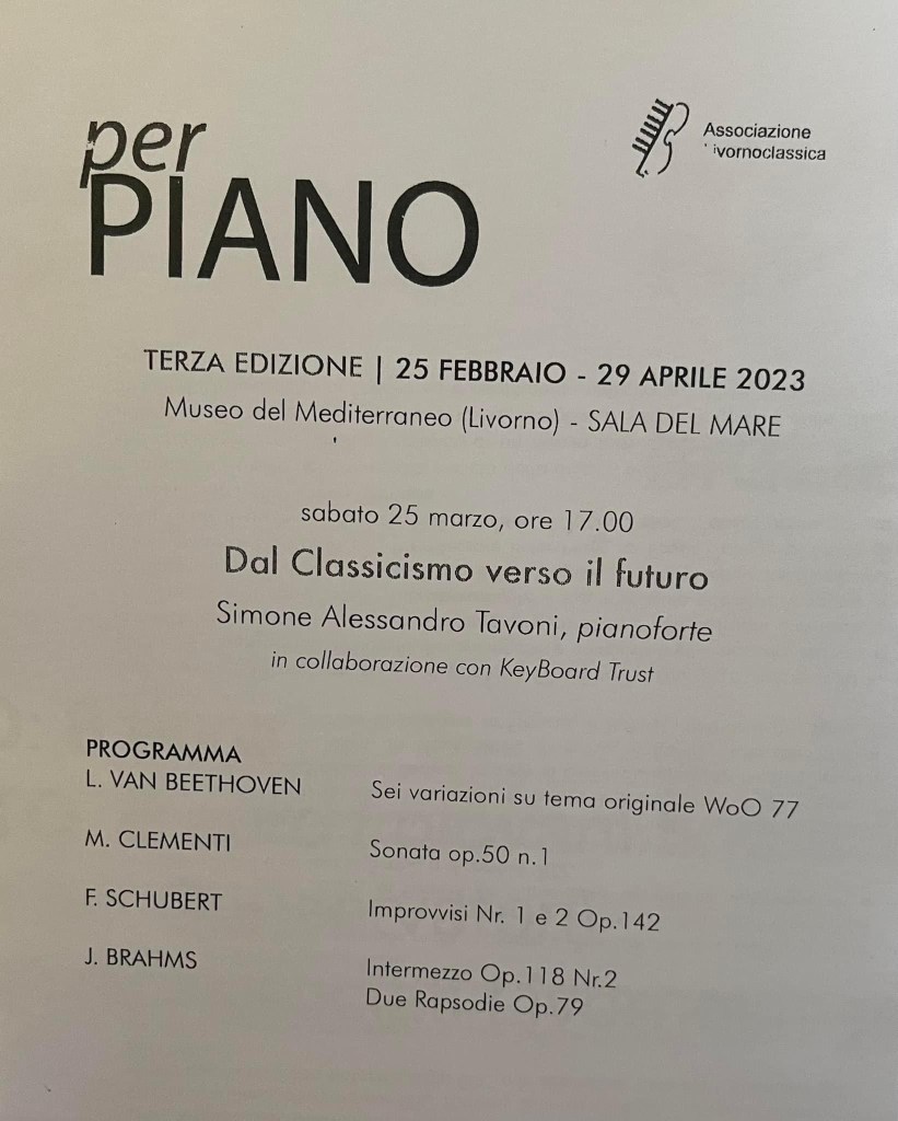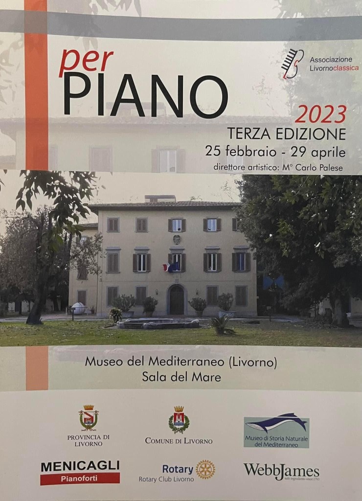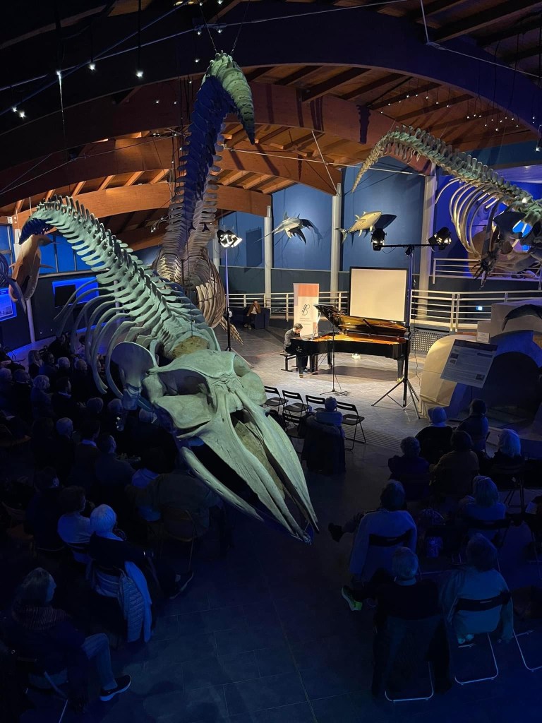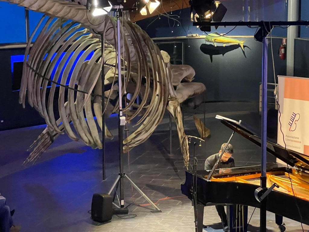 A quite extraordinary concert venue in Livorno in Carlo Palese’s per PIANO series .A new partnership with the Keyboard Trust brought Simone Tavoni to give a recital under the wings of flying dinosaurs – ‘on wings of song’ one might say!The beasts fished locally in the sand and now suspended from the ceiling for all to see in the splendid Museum of the Mediterranean.
