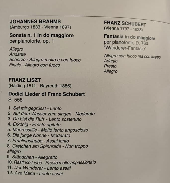 Brahms began his career as a pianist. His contribution to the piano music of the 19th century is significant in two respects: following Schubert and Schumann he cultivated the small, lyrical form, while as Beethoven’s successor he admitted large forms such as the piano sonata and variation cycle. His two variation cycles op. 21, published in 1862, place great demands on the performer. In the first cycle, on a lyrical theme in D major, the technique of figurative and contrapuntal alterations is highly developed. The “Variations on an Original Theme” although published as “No. 1,” as a set of independent piano variations–the only one on a theme of Brahms’s own devising–was certainly composed a few years later than the ‘Hungarian song ‘ set published as “No. 2.” The two sets work well when performed together, as they share a central key. The Hungarian Song op 21 n.2 was composed as early as 1853, thus even predating the “Schumann” variations op 9 .The “Hungarian Song” was given to Brahms by his violinist collaborator Eduard Reményi and as used in the variations, the “theme” is a brief, vigorous eight bars. Its distinctive aspect is the alternation between 3/4 and 4/4 bars, a typical example of Eastern European mixed meter. The ‘Hungarian Song ‘set can function as an extroverted “encore” to the more introspective and longer “Original Theme” set. The “Variations on an Original Theme” were probably composed in the late 1850s, partly as an exercise in variation technique. Brahms set several challenges for himself in devising the theme. The irregular lengths of each repeated half–nine bars each–remain mostly consistent through the variations, lending stability and recognition as other elements range farther from the theme.