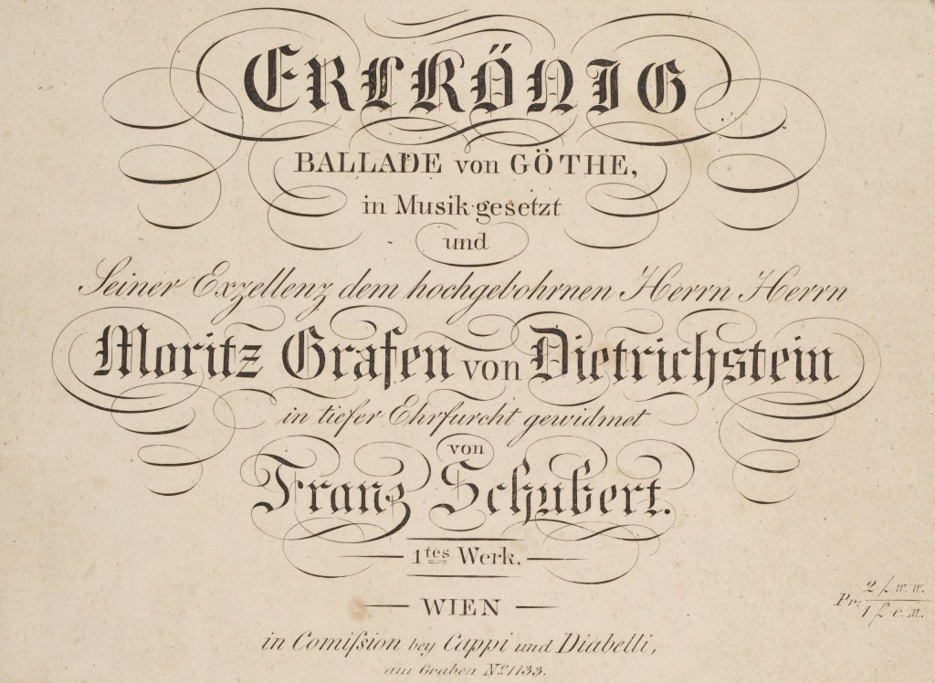“Erlkönig“, op 1 D 328, was composed in 1815,which sets Goethe’s poem.The singer takes the role of four characters — the narrator, a father, his small son, and the titular “Erlking”, a supernatural creature who pursues the boy — each of whom exhibit different tcharacteristics. A technically challenging piece for both performers and accompanists, “Erlkönig” has been popular and acclaimed since its premiere in 1821, and has been described as one of the “commanding compositions of the century”.