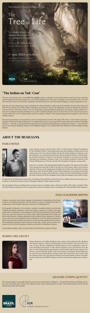 Works by Villa Lobos and Schubert completed the programme which is a reflection on the relation between nature and music.’Abaporu’ written for Pablo Rossi and commissioned by the Ministry of Foreign Affairs is a work full of aristocratic nobility in which the piano has the voice of authority aided and abetted by the string quintet.