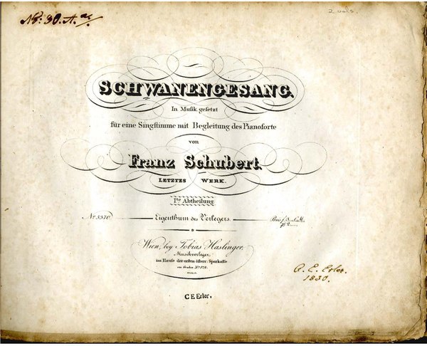 Schubert/Liszt 2 songs (Liebesbotschaft and Erlkonig). Liebesbotschaft (Message of love, the singer invites a stream to convey a message to his beloved.) is the first lied from Schwanengesang a collection of songs written at the end of his life and published posthumously. –