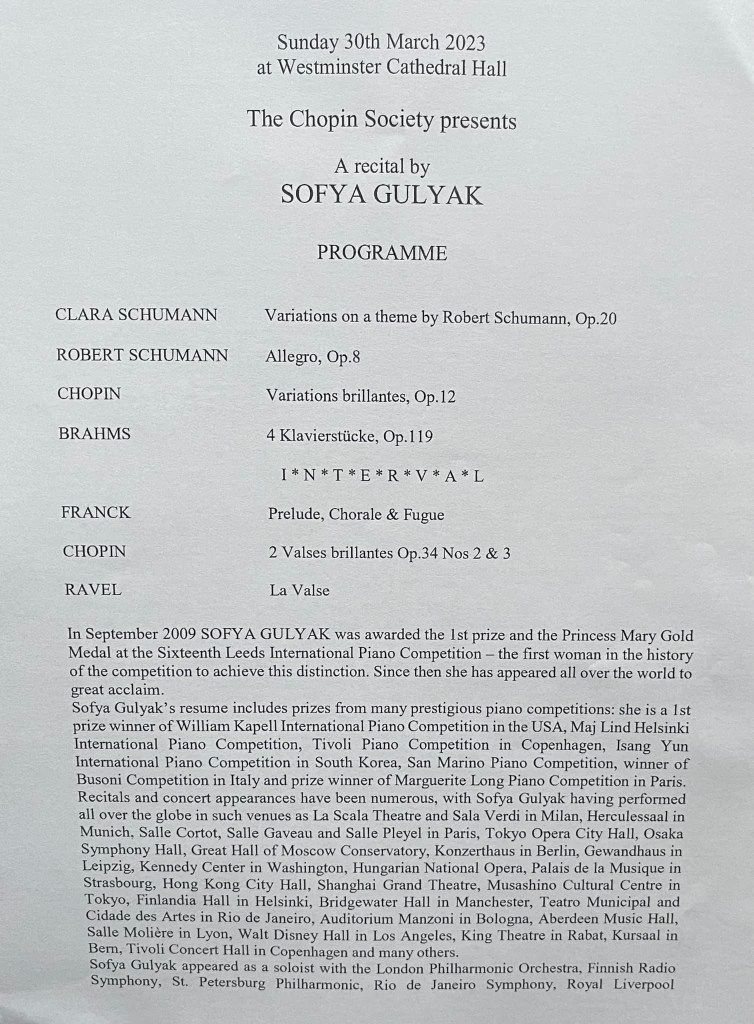 A remarkable performance in which Sofya had been able to give an architectural shape to a work that so often can seem fragmented or over emphatic.It was played with a simplicity where every detail was allowed to shine but on a great wave that took us from the first to the last note.The sumptuous sounds even in the most powerful episodes showed again her ability to draw the sounds out of the keys as a painter would add colour to his canvas.