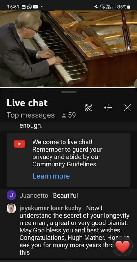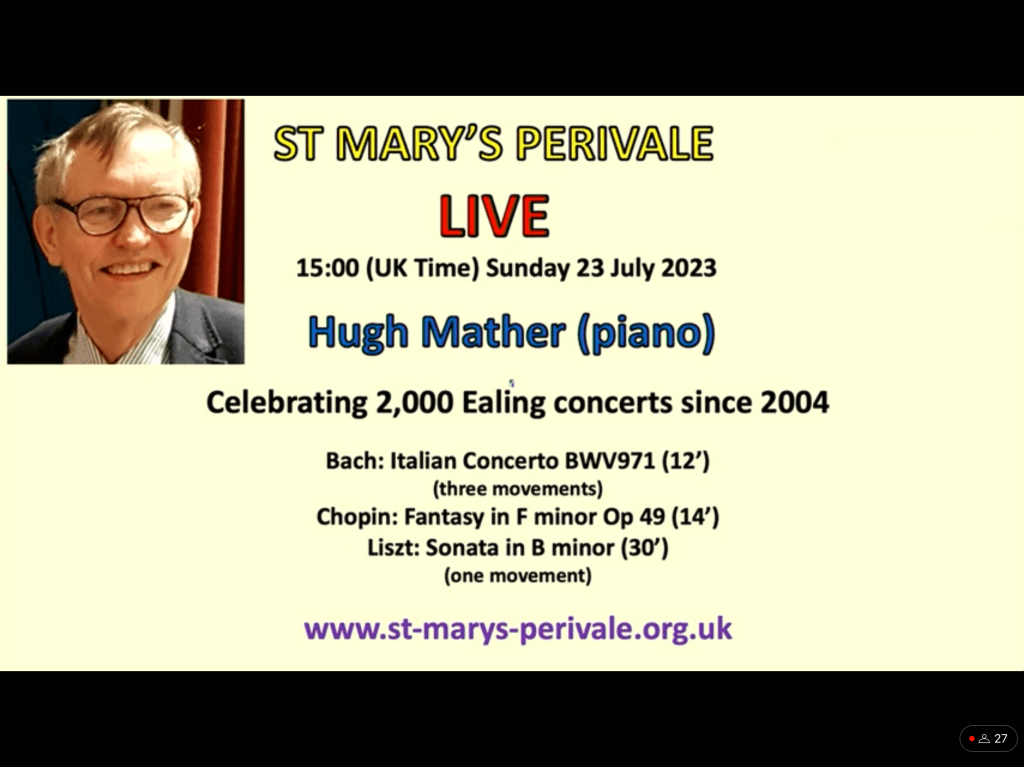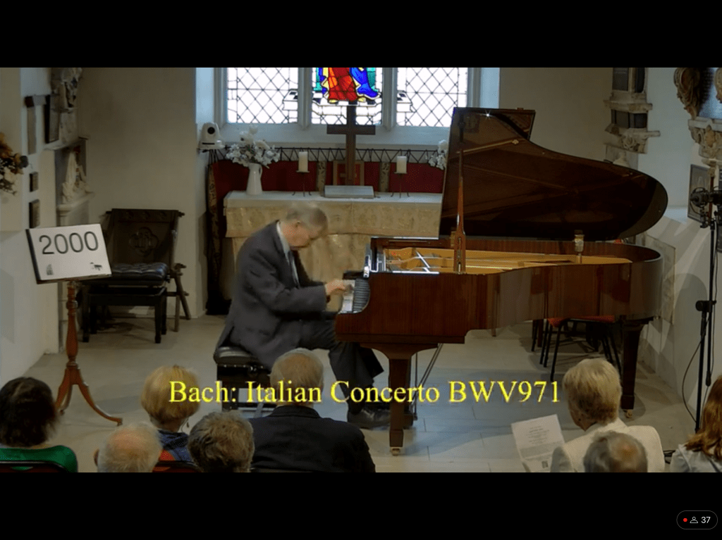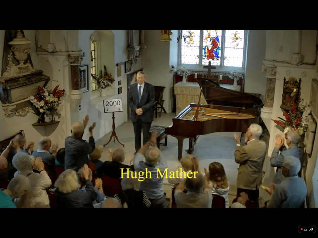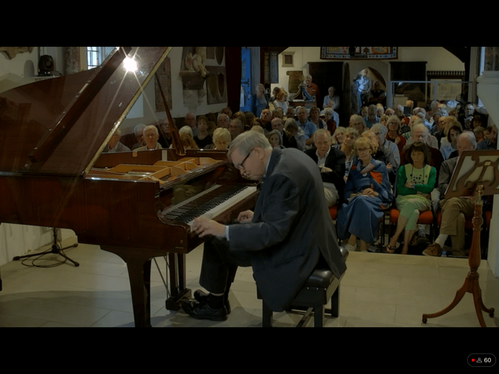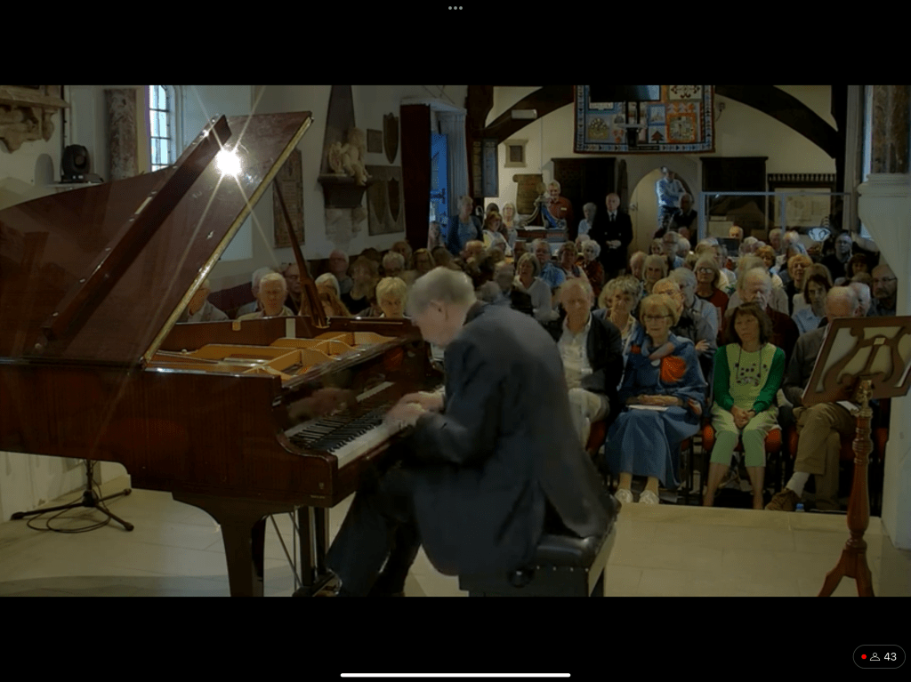 The first nocturne unwound so naturally with a beautiful sense of balance that allowed the melodic line to sing with a luminosity and ravishing sense of colour without any forcing or rhetoric.The beautiful comment of distant bells in the central episode was a revelation to me as I have never been aware of this question and answer until today.The famous E flat Nocturne was played with simple eloquence and a clarity that contrasted so well with the sombre brooding of the first.The cadenza and final bars were played on an etherial cloud but never sentimental or anything other than a ravishing simplicity and sensitivity that in no way altered the rhythmic flow that was so captivating from the first to the last note.He carried us along on a real ‘Wing of Song’.The beguiling innuendo of op 9 n.3 I remember being so captivated with,when I heard Josef Lhevine play it on an old ‘piano roll’ that had been discovered near to my home by Frank Holland.He was an engineer who was in love with the old reproducing systems of the Ampico and Welte Mignon .Pre recording systems that interested him for the mechanics but he had no idea of the treasure trove of piano roles that he had inadvertently acquired from being destroyed as the new recording systems came into commerce.Theatres and cinemas were to suffer the same fate too as the TV sat looking at us in every living room taking the place of the obligatory piano with candelabra!The Nocturne op 9 n. 3 was beautifully played with subtle sounds of understatement in which everything was infact stated.Art that conceals art is hard to define and has to be experimented as tonight revealed.I think even the mosquitos and midges seemed happy too and eventually gave up the chase as they basked in such glorious sounds.