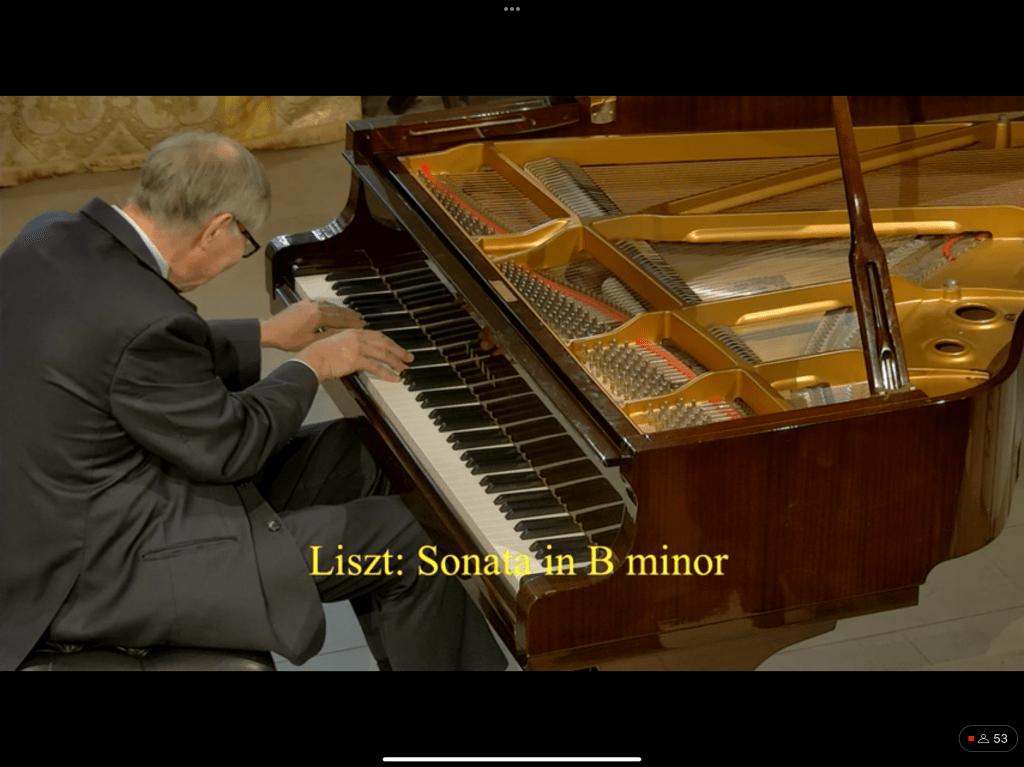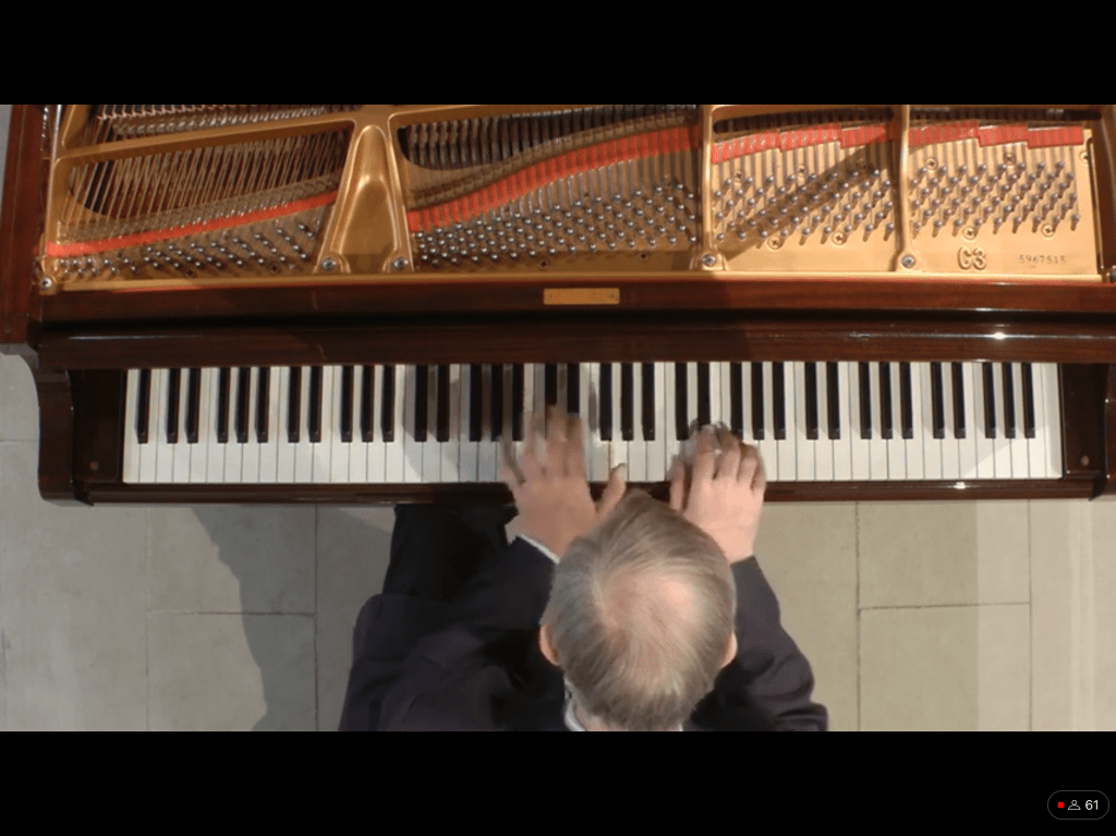 The octaves of the twenty first were played with the same shape as a symphony orchestra without hardness or empty bravura.The gentle stream of sounds of the twenty third were rudely interrupted by the passion and fire of the final twenty fourth .The deep tolling bell of the seventeenth was played with a simplicity that allowed the melodic line to float on a cloud of nostalgic remembrance like in a dream.The eighteenth ‘cadenza’ prelude that followed was played without the usual vicious accents but with a sense of line and intensity that was a suitable introduction to the transcendental hidden difficulties of the mellifluous nineteenth.