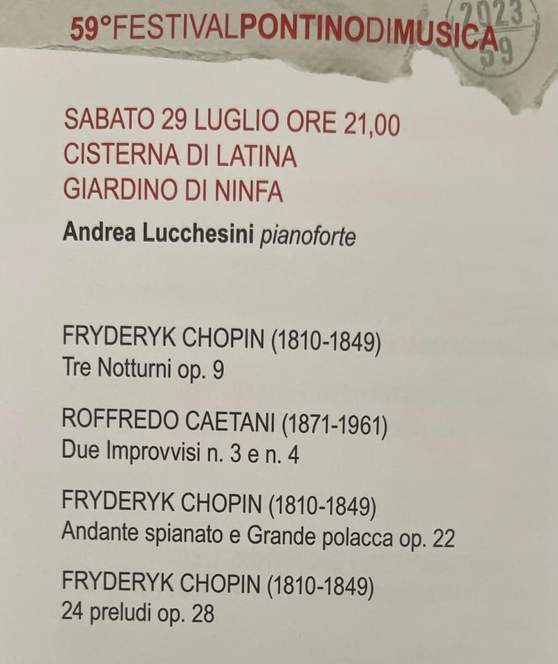 The Preludes I last heard in Sermoneta many years ago played by Fou Ts’ong.It was the genius of Ts’ong who inspired generations of young musicians in his masterclasses including in Sermoneta but mostly in the piano Academy in Como .He had surprised the world when he was awarded the ‘Mazurka’Prize at one of the very first Chopin Competitions in Warsaw.How could a Chinese pianist understand the soul of a Pole!?Ts’ong simply said that the soul in Chopin was the same soul that was in ancient Chinese poetry of which his father was an expert.A soul knows no boundaries!It was Ts’ong too who declared Chopin’s 24 Preludes to be 24 problems.More than the 24 studies because each of the preludes has a different technical problem that needs to be mastered with technical precision and artistry.