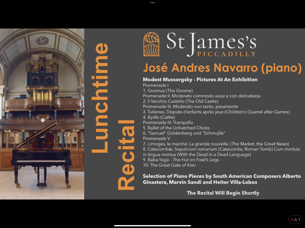 Another ‘Pictures’,two within twelve hours must be a record ……………Tyler Hay had played it and got a standing ovation at St Martin’s just a stone’s throw from Piccadilly Circus. But played by two superb musicians they were two completely different visions.