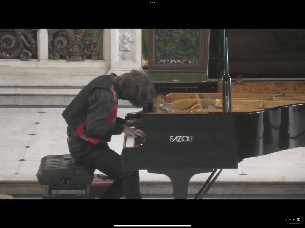 But it was the Mussorgsky Pictures at an Exhibition that showed off his true extraordinary musicianship as he managed to weld together into one complete picture a work that can too often seem fragmented.It was the collection that he had shown us of the exhibition of the individual paintings by his friend Victor Hartmann struck down so unexpectedly early in life .It showed a tour de force of control and technical authority that allowed him a full palette of colours and at the same time his Latin temperament could have full range but always within a musical framework that could see the overall larger picture.Resonance and clarity of the opening promenade led to the very energetic ‘Gnomus’with its frightening contrasts and startling final cascade of notes.Ease and delicacy led to the next picture of ‘The Old Castle’.It was played in a beautiful flowing ‘two’ that allowed the musical line to float on thin air and to be shaped with natural beauty.Finally blowing itself out with two gentle sighs as the Promenade to the next picture took on a more decisive gait.’Tuileries’ was played at quite a speed but always with the insistent child like pulsation on which filigree work was played with great precision and nonchalant ease .’Bydlo’ came bursting onto the scene with its lumbering insistence building to a mighty climax only to disappear into the distance as the promenade returned this time with luminosity and delicacy.The ‘Unhatched chicks’ was played with remarkable precision and dexterity and the trills were like mere vibrations of sound.There was drama as Samuel Goldenberg entered the scene with his imposing recitativo .Only to be answered by the delicate and intricate sounds of Schmuyle.A passionate discussion follows that was played with superb forward movement until the gentle grief stricken comment dismissed by the dominance of Goldberg.’The Market place in Limoges’ was full of nervous energy and was quite a tour de force of precision and colour.The resonance of the chords of the Catacombs was remarkable for the sumptuous full sounds and startling contrasts between each of the meandering chords.There was great technical control in ‘the Dead in a Dead Language’ with shimmering beauty as it reached for the unspeakable heights.Chased away by ‘Baba Yaga’ who suddenly came bursting onto the scene with such technical command and dynamic energy.The middle section again showed off Jose’s complete mastery of texture as he allowed the right hand to accompany the melodic line in the left hand before Baba Yaga appears on the scene again.A transcendental control of sound meant that the Great Gate of Kiev could be heard in all its many forms from the gentle apparition at the beginning to the mighty dramatic central episode with it’s cascading bells sweeping across the entire keyboard .Dissolving into the calm of a plain chant where the gradual pealing of bells was to build up to the enormous final declamation of a truly great Gate of Kiev.A remarkable performance played with the seriousness and intelligence of a true thinking musician but with a Latin temperament and heart of gold.