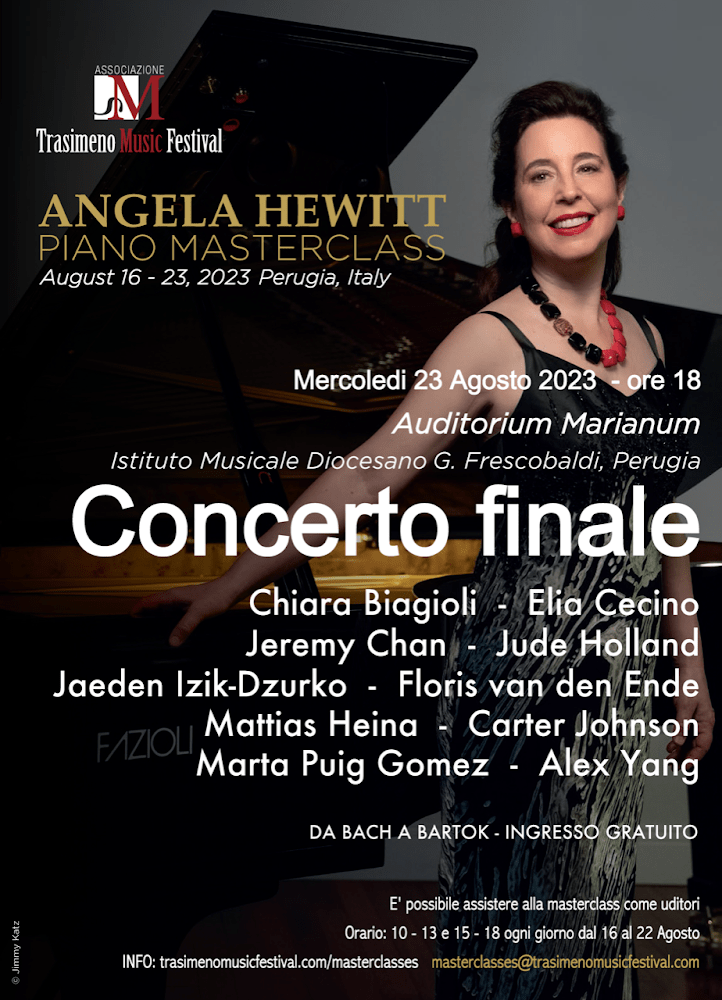 P.S.”I’m still thinking about the masterclass we had in Perugia….and the happy time it was. I am asked to be on many juries of international competitions, but now I refuse them all. How much better it is to do this kind of thing, where you really get to know the personality of each student, where you can help them not just as pianists but as people: help them develop, help them see other things in life. It was especially great to see how well they all got along together–even the oldest ones with the youngest one (ages 14-30). We also appreciated the addition of the few auditors who came for the week, including a young boy from Perugia who attended for several days–getting permission from his mother to take time off from his homework: that was really good to see. I will do it again, though probably not next summer. Every two years is fine. That gives me the chance to follow the present group a bit. Anyway, thank you, Jeremy, for your words below and to all the other students who wrote such happy thoughts afterwards online.”Angela Hewitt