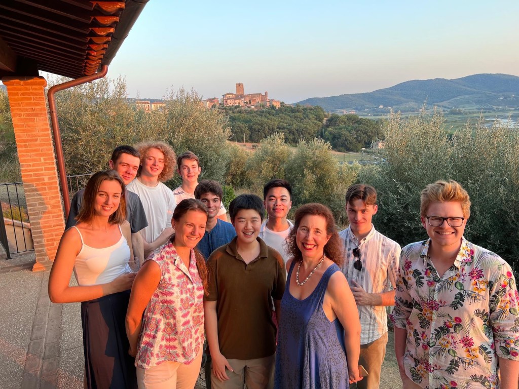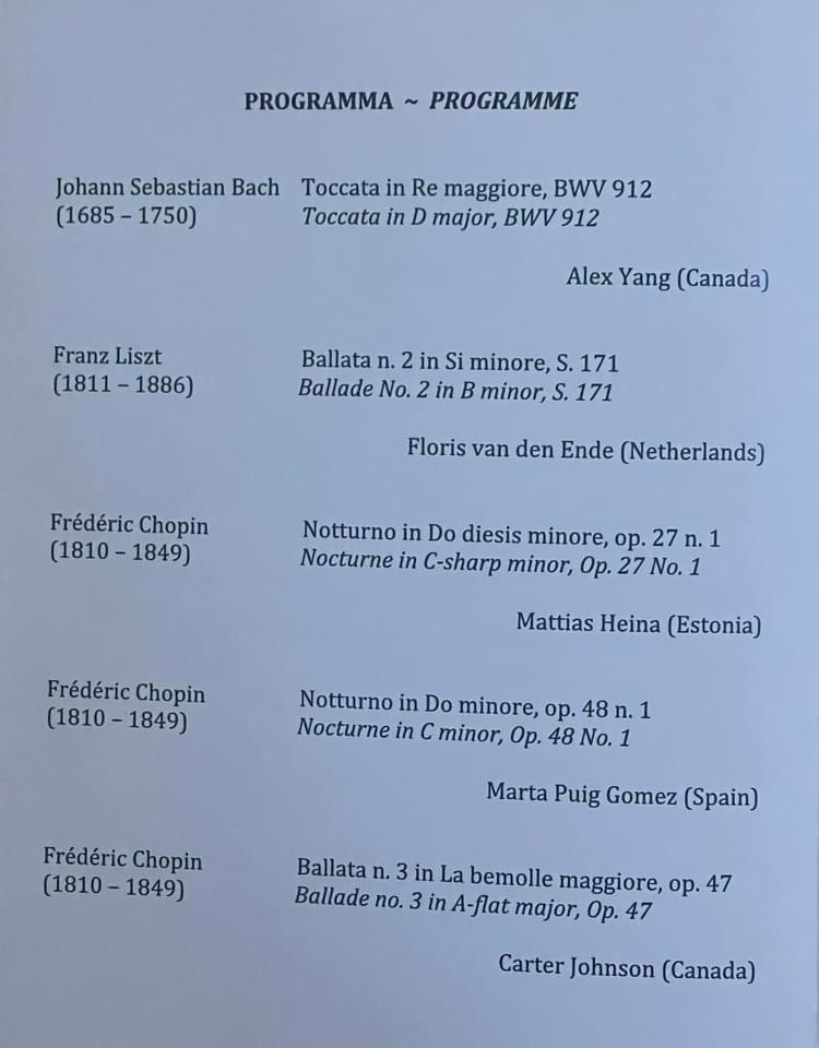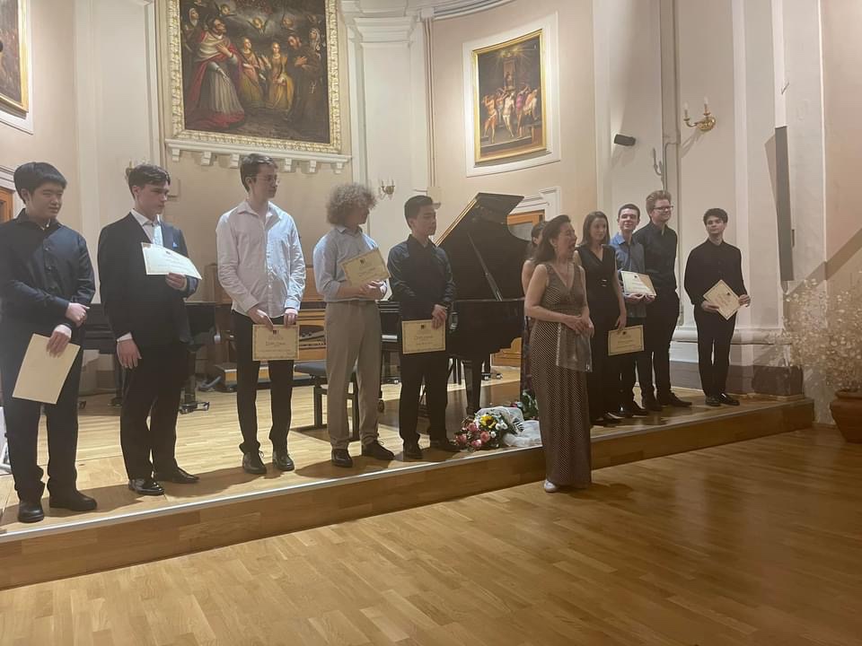 The masterclass portion of the course is now officially over. Now, my improvements: after all these classes I have not only experienced the wide dynamic range and colour palette of the Fazioli F278, but I also have started to learn how to control the sound and create different colours. Having played in a very resonant hall, I learned to control the sound to match the acoustics and not to pedal wash everything (which will make the notes sound like a blur). I also gained various competition, concert and life experiences from the others as well as Angela, which will definitely help me in the future. Collectively, I think that all of us 10 students have gotten somewhat better at controlling the sound of the Fazioli compared to the first day, and try not to bang on it for everything we play. As well, most of us have probably discovered new repertoire that we want to learn (I certainly did!) or furthered our understanding of the ones we have previously played. All in all, it was a wonderful week, and kudos to Angela for getting through all this large repertoire, teaching 6 hours every day, getting such a nice Fazioli to play on, as well as organizing such a big trip to Lake Trasimeno! 🍻 Your coaching made us sound better on that Fazioli, and I’m looking forward to playing my Bach Toccata in the Final Concert tomorrow!