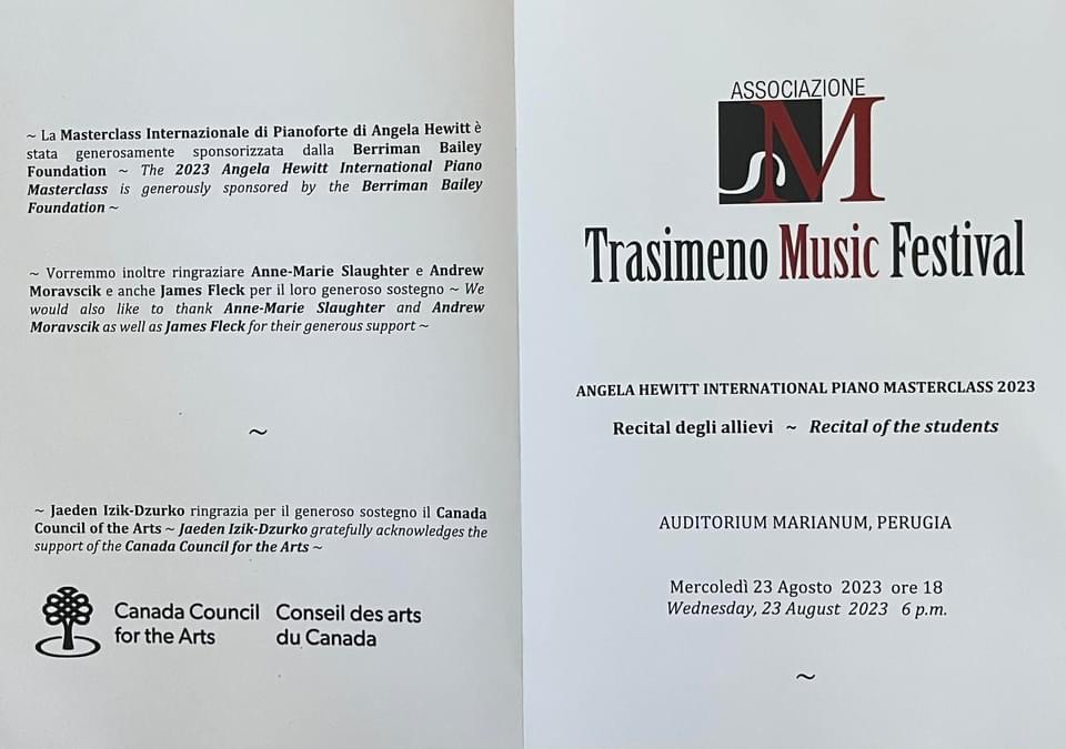 Carter Johnson writes :”It was a distinct pleasure to be able to work alongside some new friends with Angela Hewitt for a week in Perugia. She invested countless hours in helping us search out clearer musical ideas, a constant awareness of counterpoint, judicious pedaling (!) and above all, ever more beautiful sounds — and at the very end of the last day, it was an unexpected delight to give an impromptu duet performance of Mozart K 453 with Angela at the solo piano and me with the orchestral part. Many thanks to Angela for your generosity, and to my colleagues!”