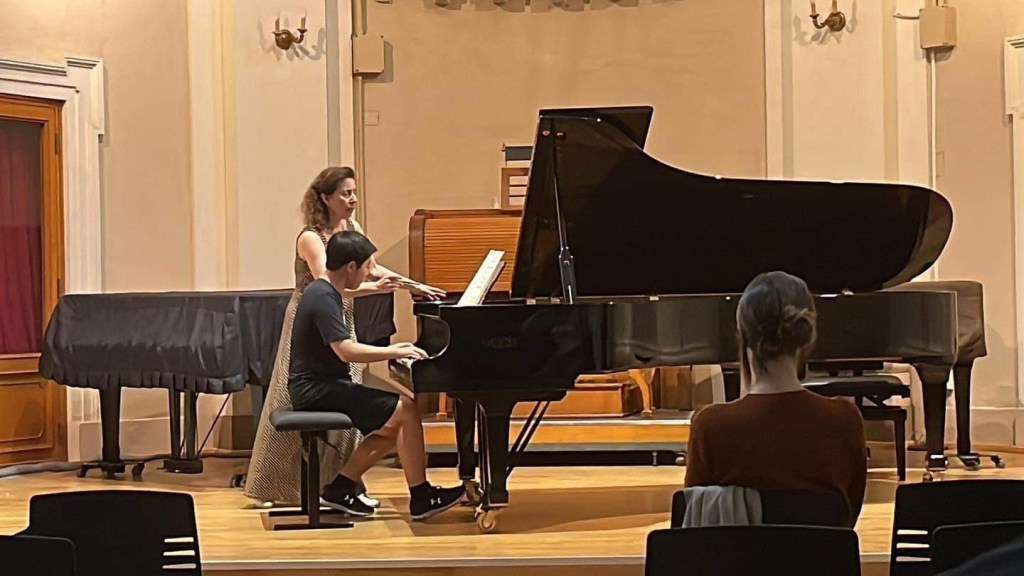 Day 4 – Angela worked again for 6 hours straight (and on very heavy and long music too). I admire her brain capacity 👍. Anyways, today was dedicated to pieces from the Romantic period. I had prepared my Mendelssohn Variations Sérieuses. Long story short, after playing it for Angela, she pointed out some details I missed and techniques that I could use to improve my dynamic range on the Fazioli. Playing this piece especially allowed me to further explore the wide dynamic range and colour palette of the Fazioli F-278, as each variation features a new technique and demands a new colour. I especially liked her comparison of the singing style of the D major variation (Var. 14) to “Hear My Prayer” by Mendelssohn, a choral work I never listened to before. A romantic music fan myself, whether it be Chopin, Liszt, or Schumann, I discovered many pieces I never heard before like the Mendelssohn F# Fantasy and the Liszt B minor ballade, two works I will MOST DEFINITELY add to my repertoire in the future. The Nocturnes Opus 48 were also played: I have learnt a few Chopin nocturnes and so I can apply what I heard to my own. Two people also played Schumann’s Carnaval and Sonata 1. I haven’t learned any big Schumann pieces yet, but I intend to, and probably will take what I have learned about Schumann’s general style to whatever I learn. I also gained some great learning resources from the notes I took in class about Chopin’s Sonata 2 and Chopin’s Ballade 3, two pieces I intend to learn next year. Tomorrow, others will play a variety of works, from the notorious Liszt Sonata to the beautiful Chopin Barcarolle to the Bartok piano sonata, a juggernaut of the piano repertoire. I will be playing a piece she also learned in her youth: Liszt’s Gnomenreigen.