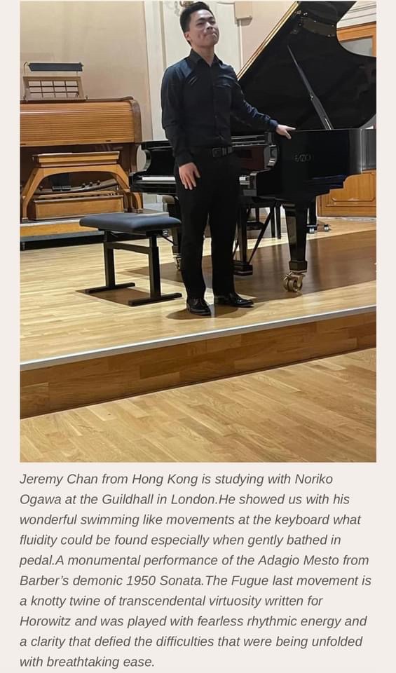 Jeremy Chen writes: It was a great privilege and honour to have been chosen to work with Angela Hewitt for a week in Perugia, Italy this August, culminating in a final concert last week during which I played the last two movements of Barber’s sonata to a lovely audience as well as a rude, unpaying cat who stole the show (pictured below). But thank you to Christopher Axworthy for the kind words on my performance!